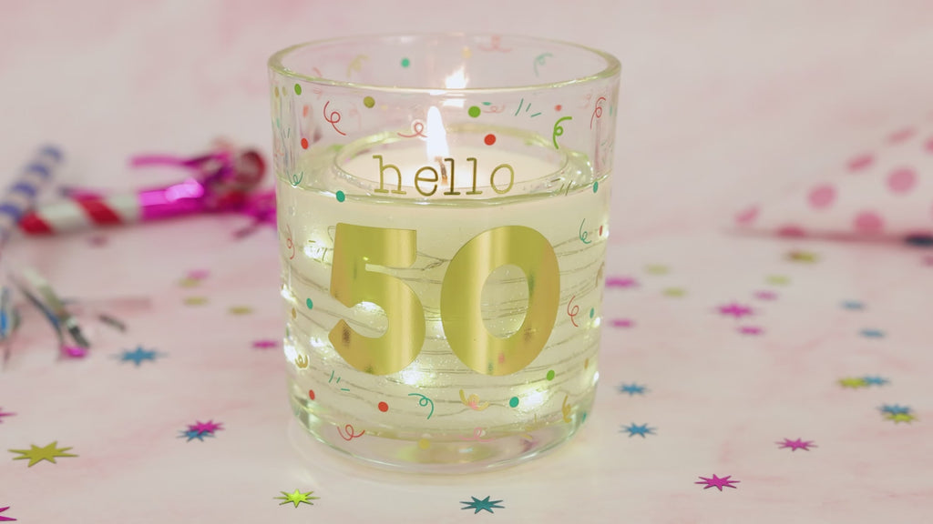 - PREMIUM QUALITY: This single-wick soy wax LED candle features a colorful confetti design on a sturdy glass vessel. The "Hello 50" gold metallic text is prominently displayed alongside festive balloons, adding a celebratory touch. This candle can be lit or you can use a candle lamp to activate the LED lights. Packaging includes a Kraft die-cut box, making it gift-ready.