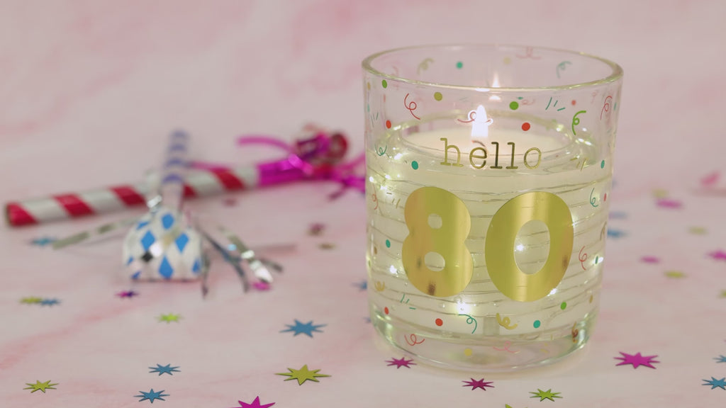 - PREMIUM QUALITY: This single-wick soy wax LED candle features a colorful confetti design on a sturdy glass vessel. The "Hello 80" gold metallic text is prominently displayed alongside festive balloons, adding a celebratory touch. This candle can be lit or you can use a candle lamp to activate the LED lights. Packaging includes a Kraft die-cut box, making it gift-ready.