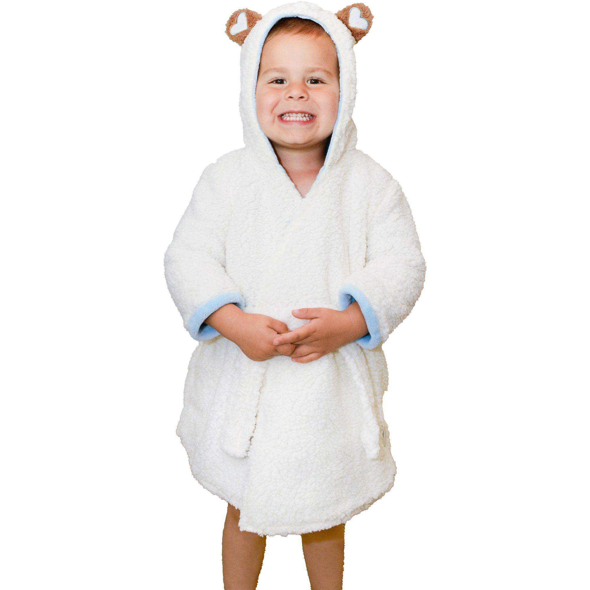- PREMIUM QUALITY: This toddler bathrobe is made from ultra-soft 100% polyester Sherpa, providing both comfort and warmth. The cream-colored exterior features brown Sherpa bear ear accents, while the royal plush blue interior and cuffs add a pop of color. Ideal for toddlers aged 12-24 months.