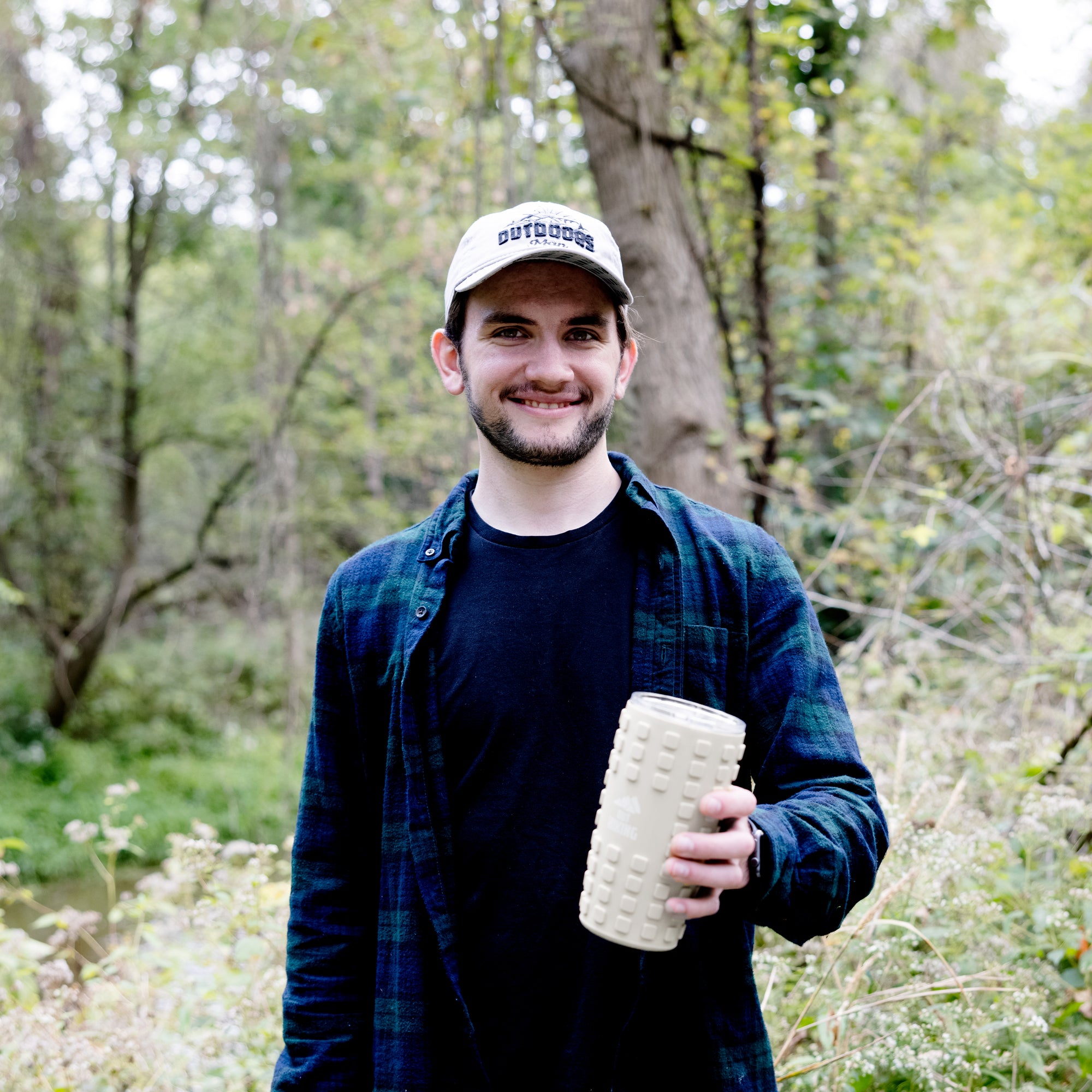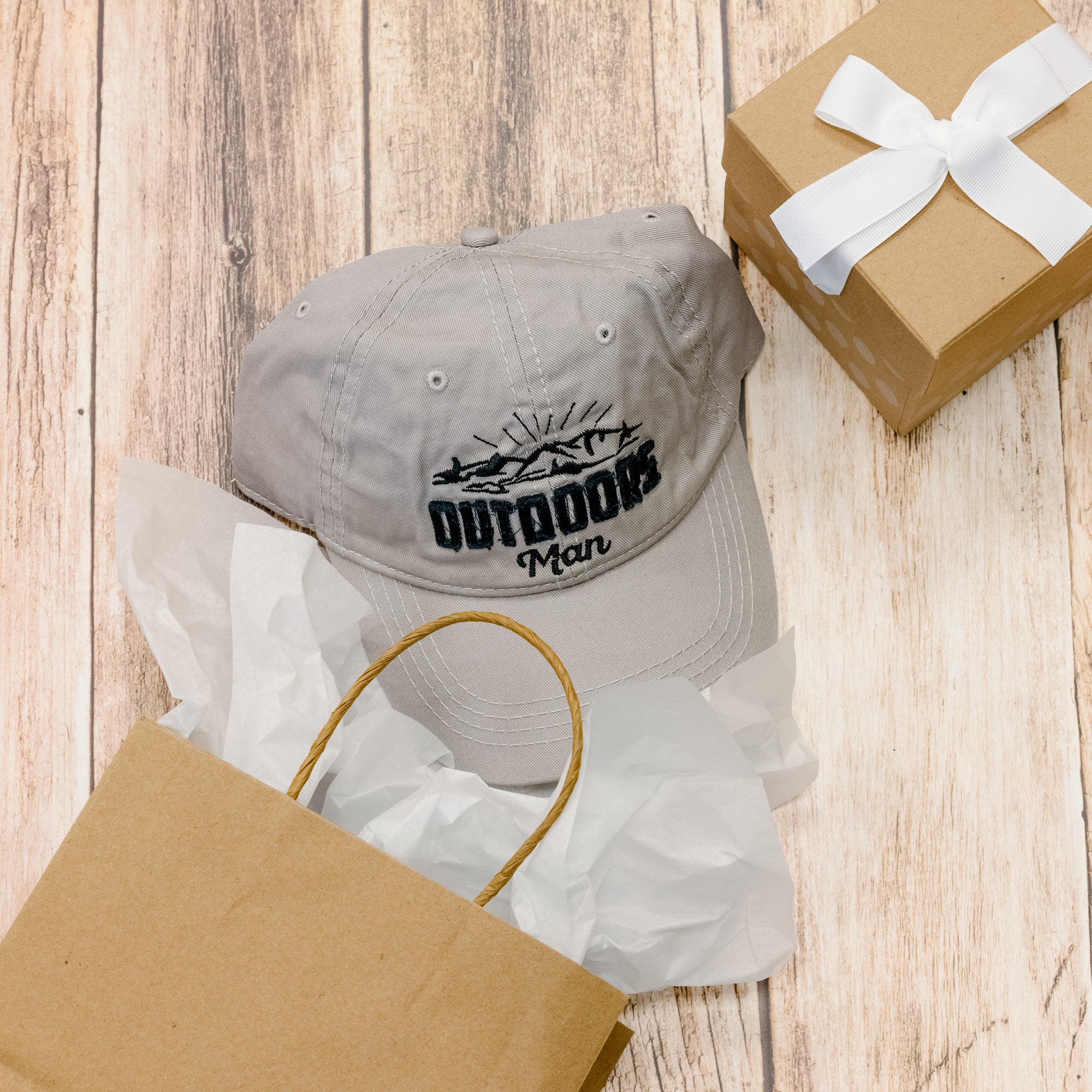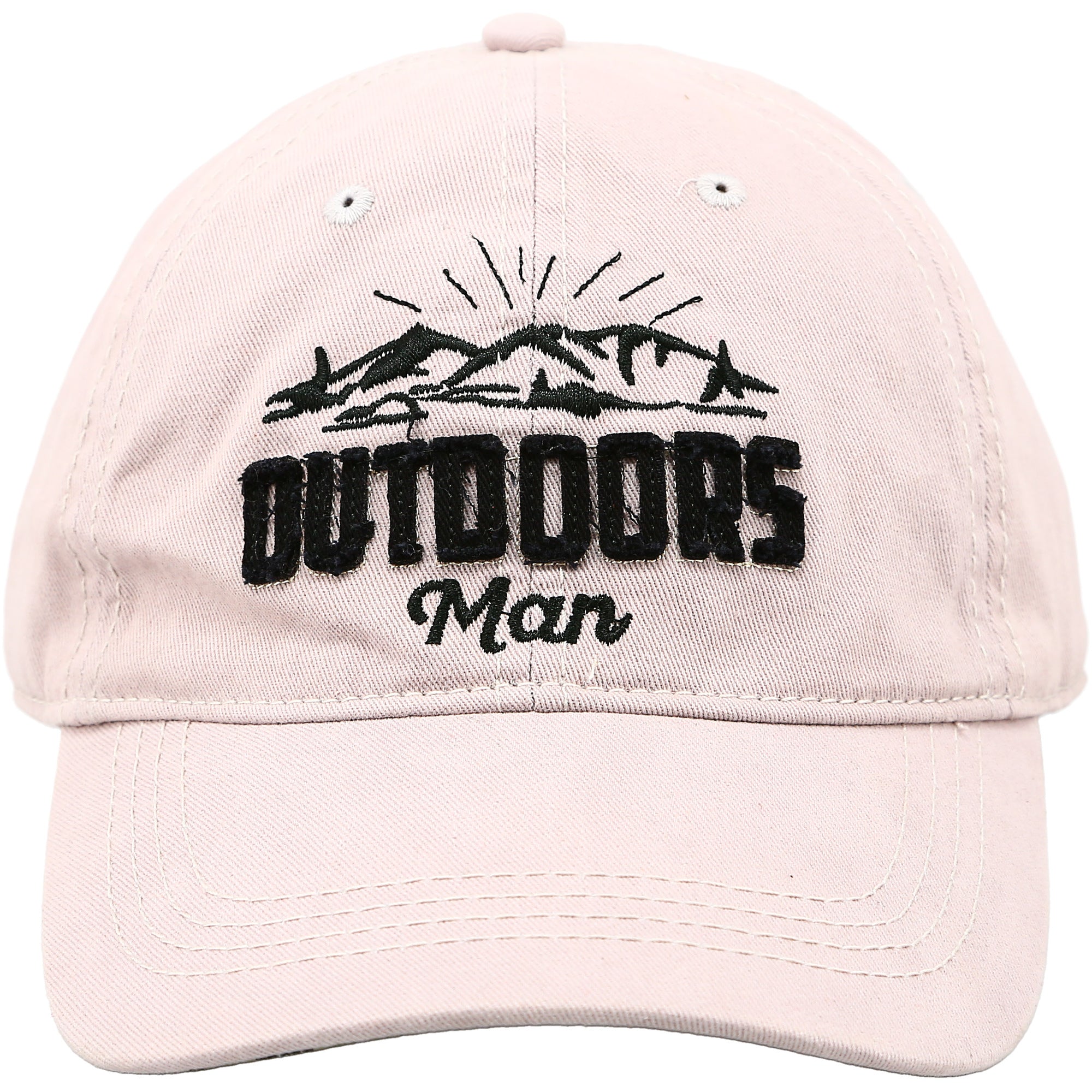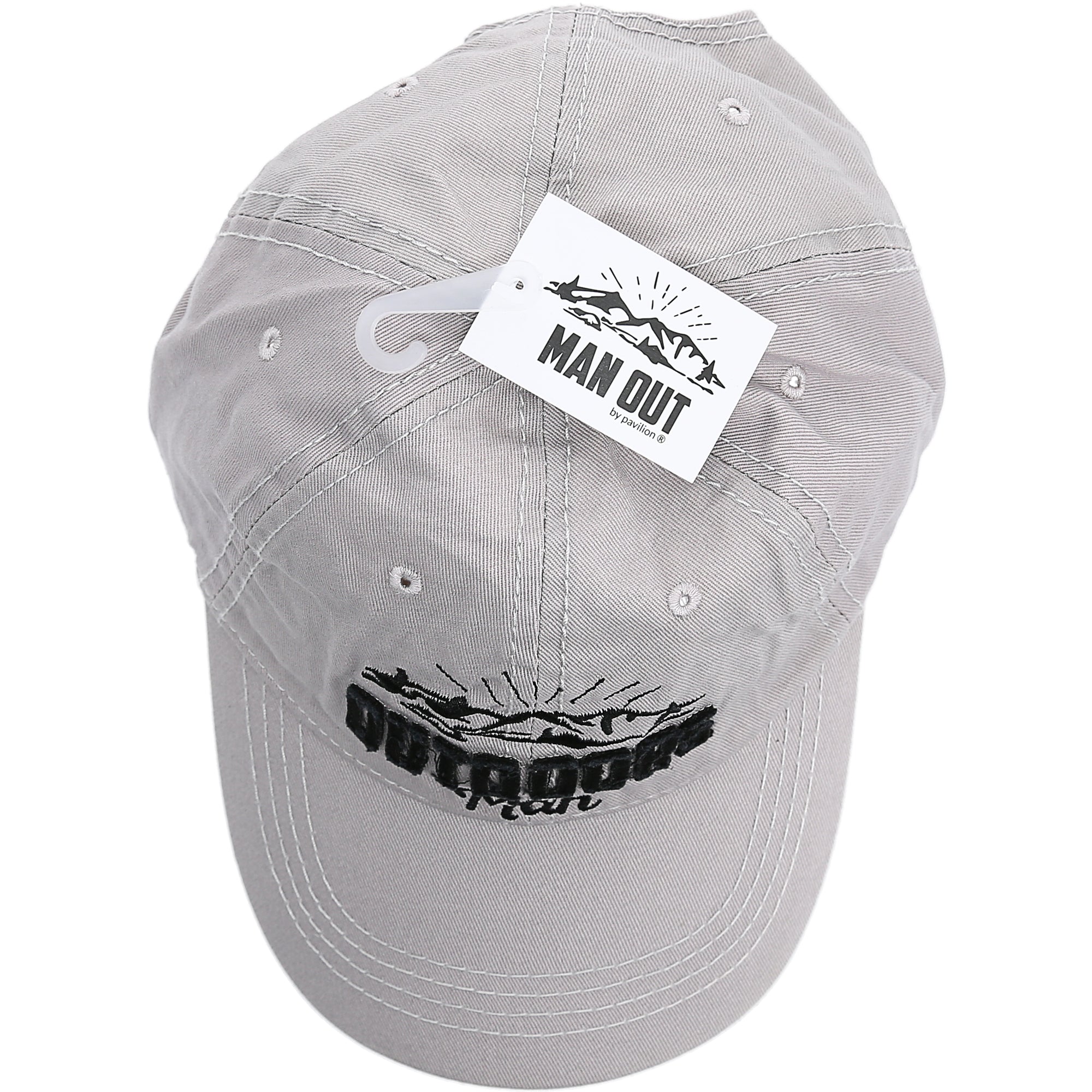 - IN-HOUSE DESIGN: The interior brim is lined with a matching flannel plaid pattern. "Outdoors Man" sentiment embroidered and appliqued onto the front of the light gray hat, which features a black mountain range design. Packaged in a plastic polybag with hangtag.