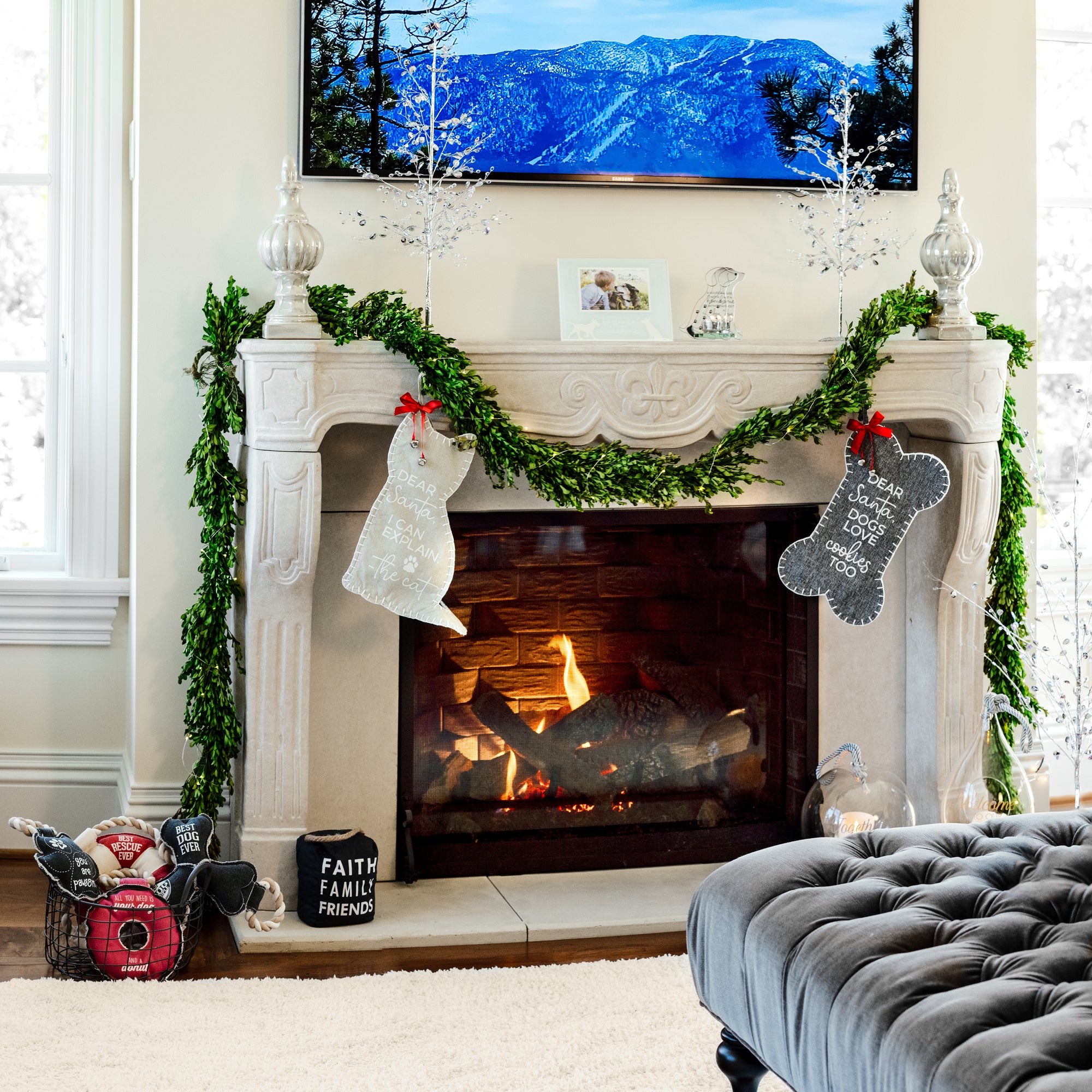 - IN-HOUSE DESIGN: "Dear Santa, Dogs Love Cookies Too" white sentiment-printed decal is applied to the front of the stocking. The sewn-in cream fabric tag on the ornament states, "I Love My Fur Baby," printed in gray.