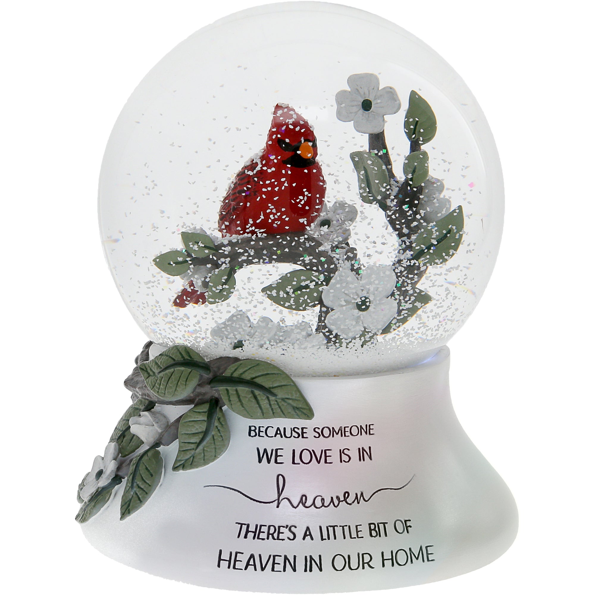 - IN-HOUSE DESIGN: The red cardinal sits on a cherry blossom branch inside the globe. The bottom front section has a "Because Someone We Love Is In Heaven, There's A Little Bit Of Heaven In Our Home" sentiment. When twisted, the piece pipes "Wind Beneath My Wings."