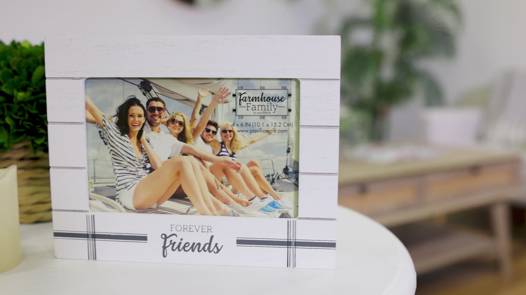 • IN-HOUSE DESIGN: Neutral modern farmhouse weathered white wood-washed shiplap look sturdy wood veneer and MDF construct with glass front. "Forever Friends" gray decal sentiment accompanied by a gingham, plaid, checkered pattern. The backing has four metal tabs for photo replacement. Self-standing or can be hung by the edge.