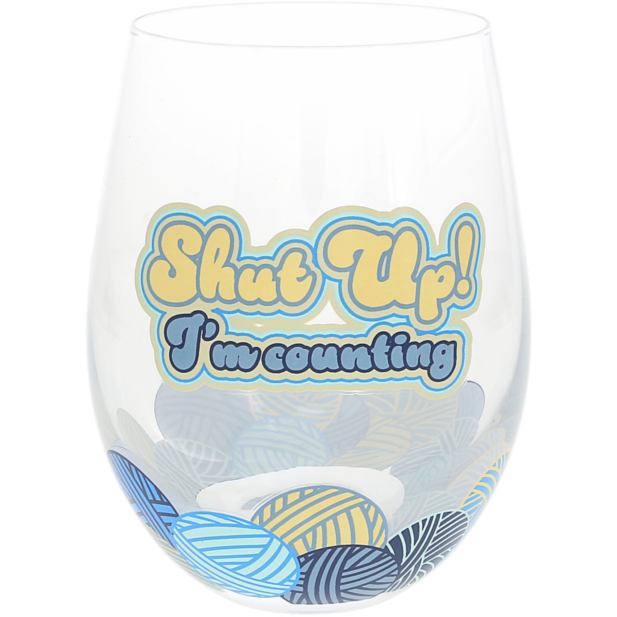 - PREMIUM QUALITY: This 18 oz stemless wine glass is crafted from high-quality glass to ensure durability while holding a 18 oz of your favorite wine or beverage. Measuring 5"x3", the glass sits comfortably in hand with its smooth, rounded shape. Designed to bring a bit of humor to your knitting or crocheting sessions, the glass features a fun sentiment, "Shut up! I’m counting." Whether you're relaxing after a long day or enjoying a quiet moment, this glass will quickly become a favorite. It arrives packaged in a die-cut box for safe delivery and easy gift-giving.