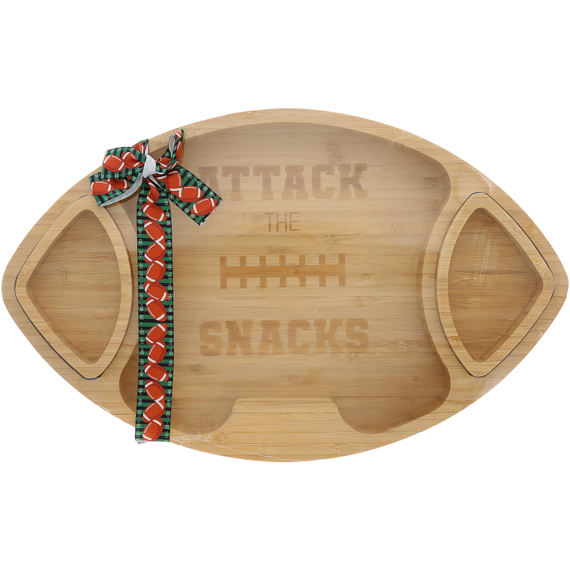 - IN-HOUSE DESIGN: "Attack the Snacks" engraved on a football-shaped bamboo serving board, featuring two dip bowls for versatile snacking. This eco-friendly platter enhances your entertaining style, perfect for sports events, parties, or gifting. Ideal for showcasing appetizers, it adds a playful touch to any gathering. Durable and easy to clean, this board complements your hosting collection while being both functional and stylish. A must-have for game day or any festive occasion!