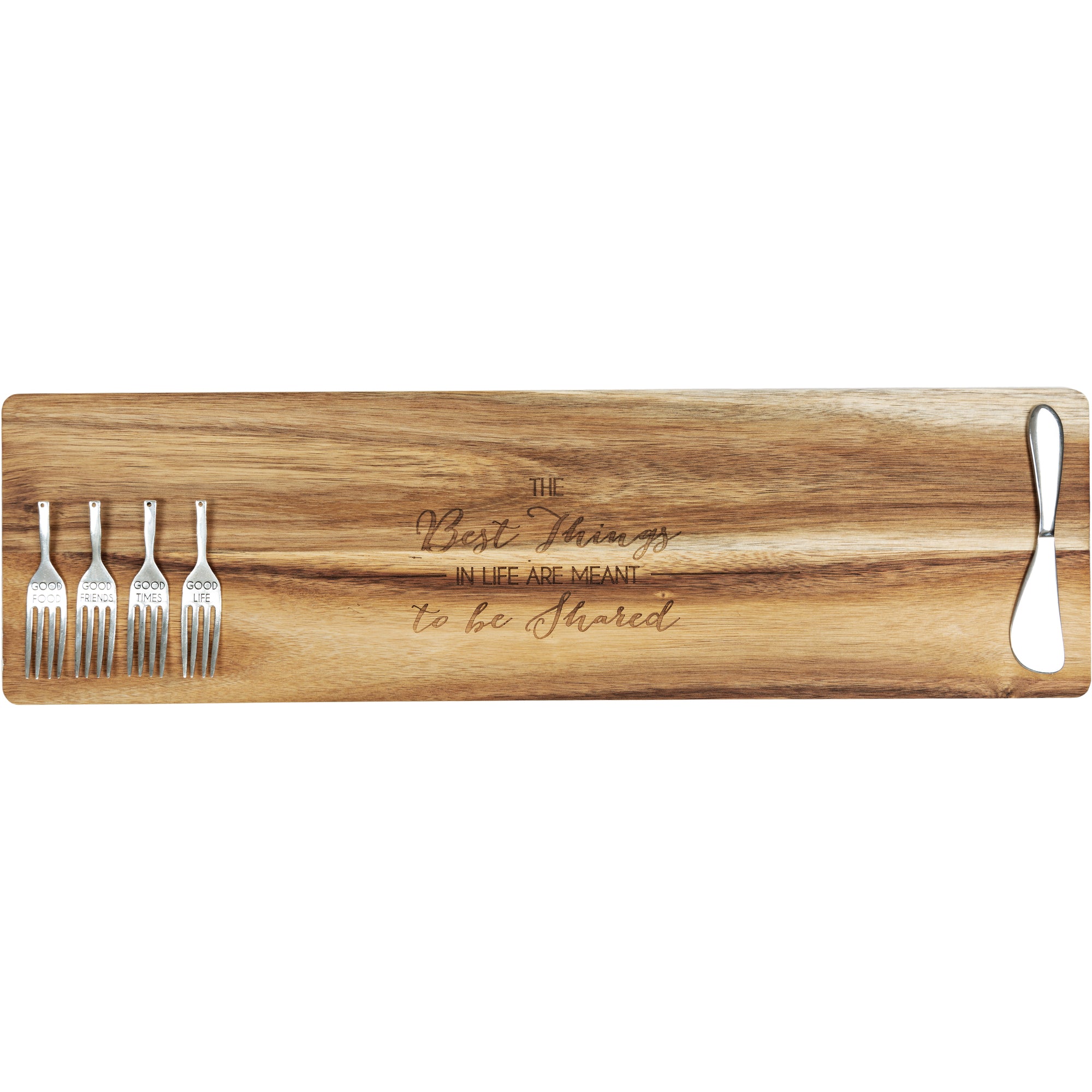 - IN-HOUSE DESIGN: "The Best Things In Life Are Meant To Be Shared" text is laser engraved into the top of the serving board. Accompanying forks feature engraved "Good Times", "Good Food", "Good Friends", "Good Life" texts.