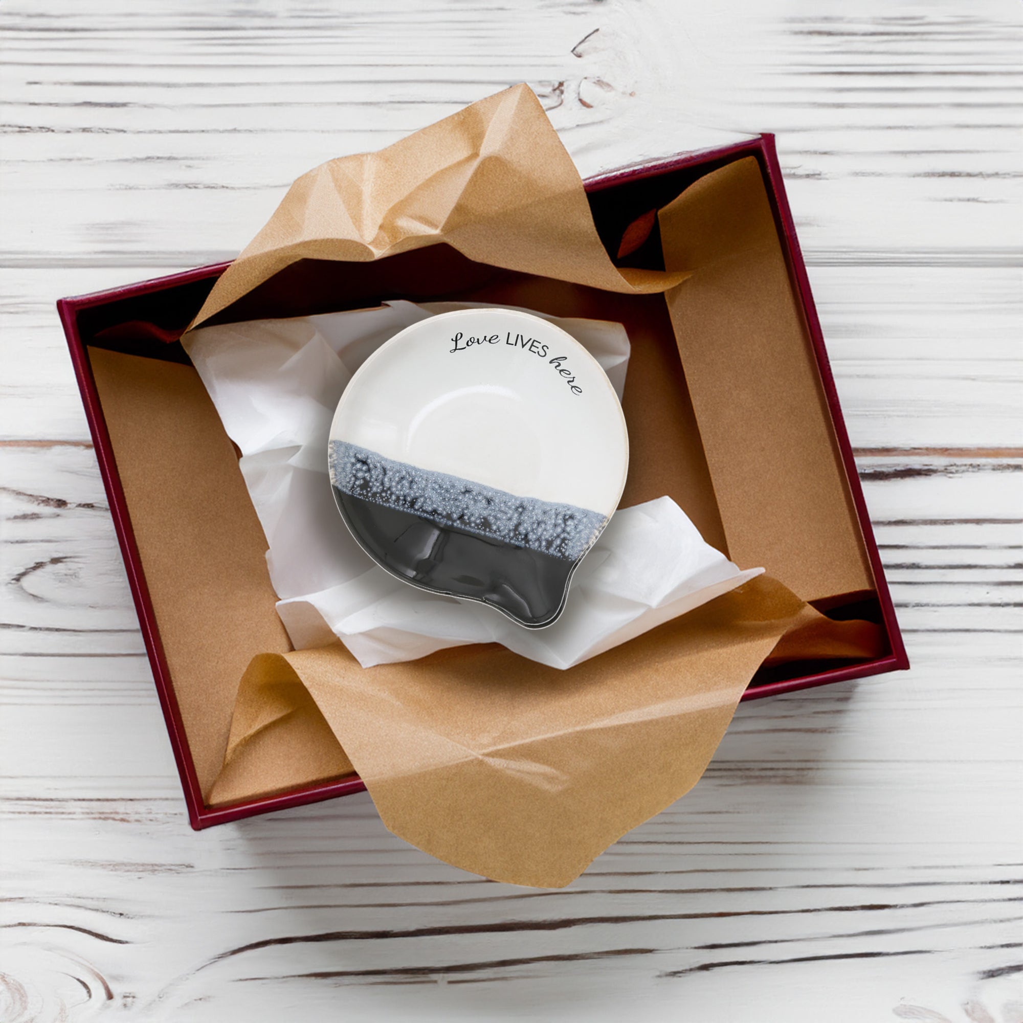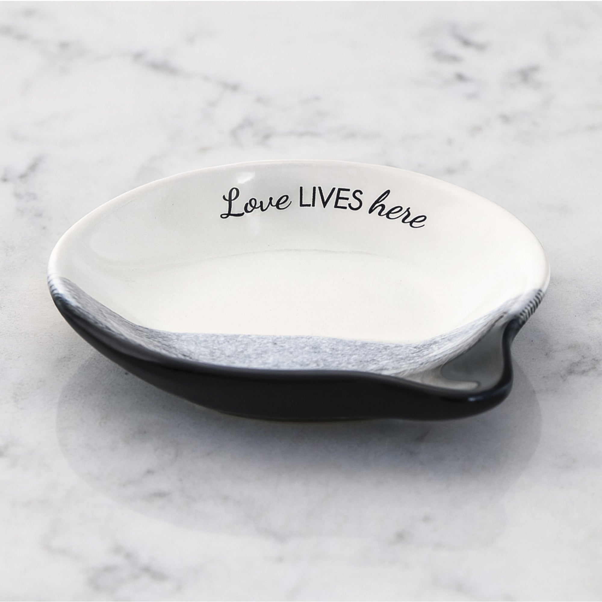 - IN-HOUSE DESIGN: The tri-colored white, medium blue, and dark blue glazes are reactive, making each piece unique. The "Love Lives Here" sentiment wraps around the edge of the holder.