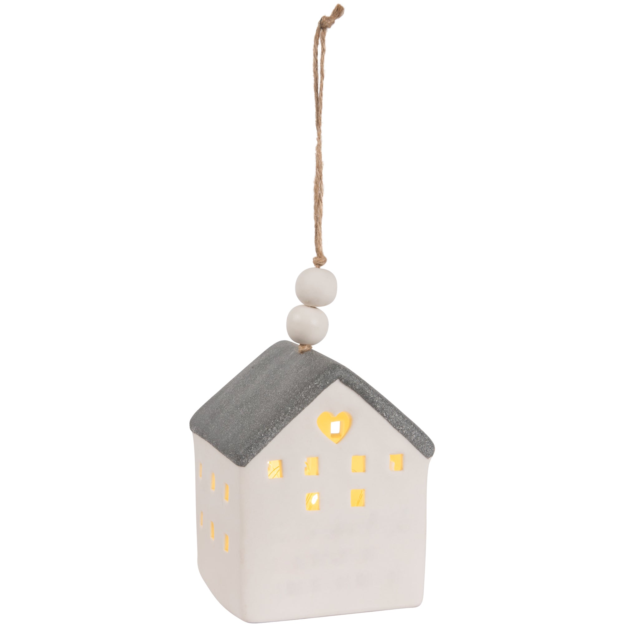• PREMIUM QUALITY: LED house-shaped lantern, packaged in a printed box, is made from porcelain and features twine for hanging.