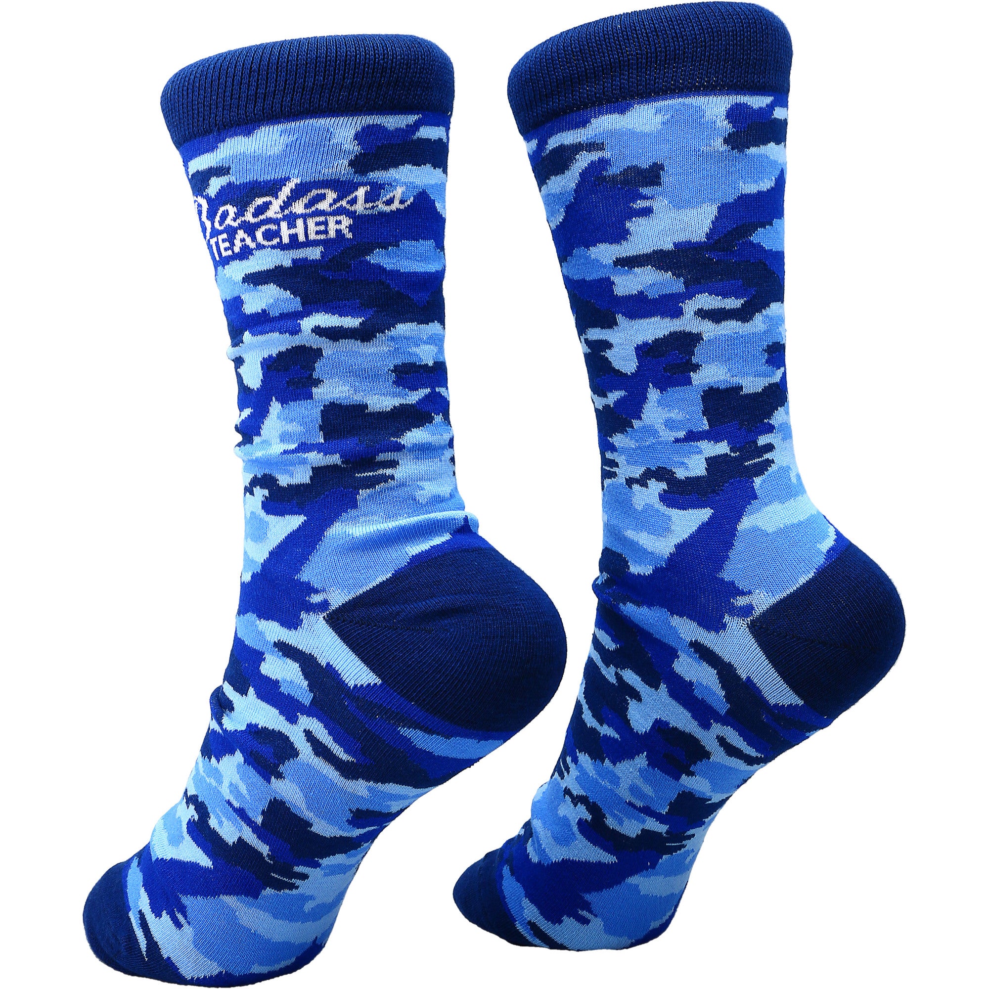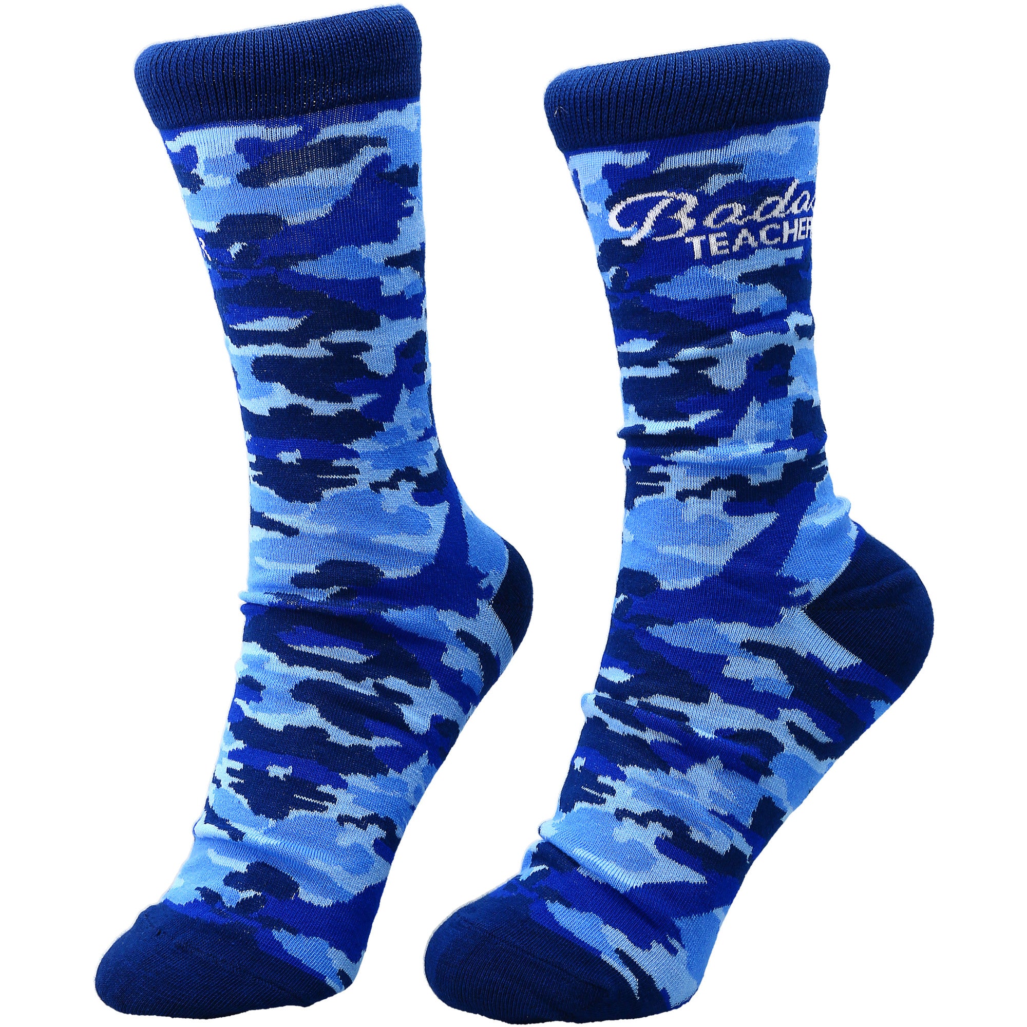 • IN-HOUSE DESIGN: "Badass Teacher" text is sewn into the side of the socks with a blue camo pattern that covers all but the heel, ankle and toe which are solid.