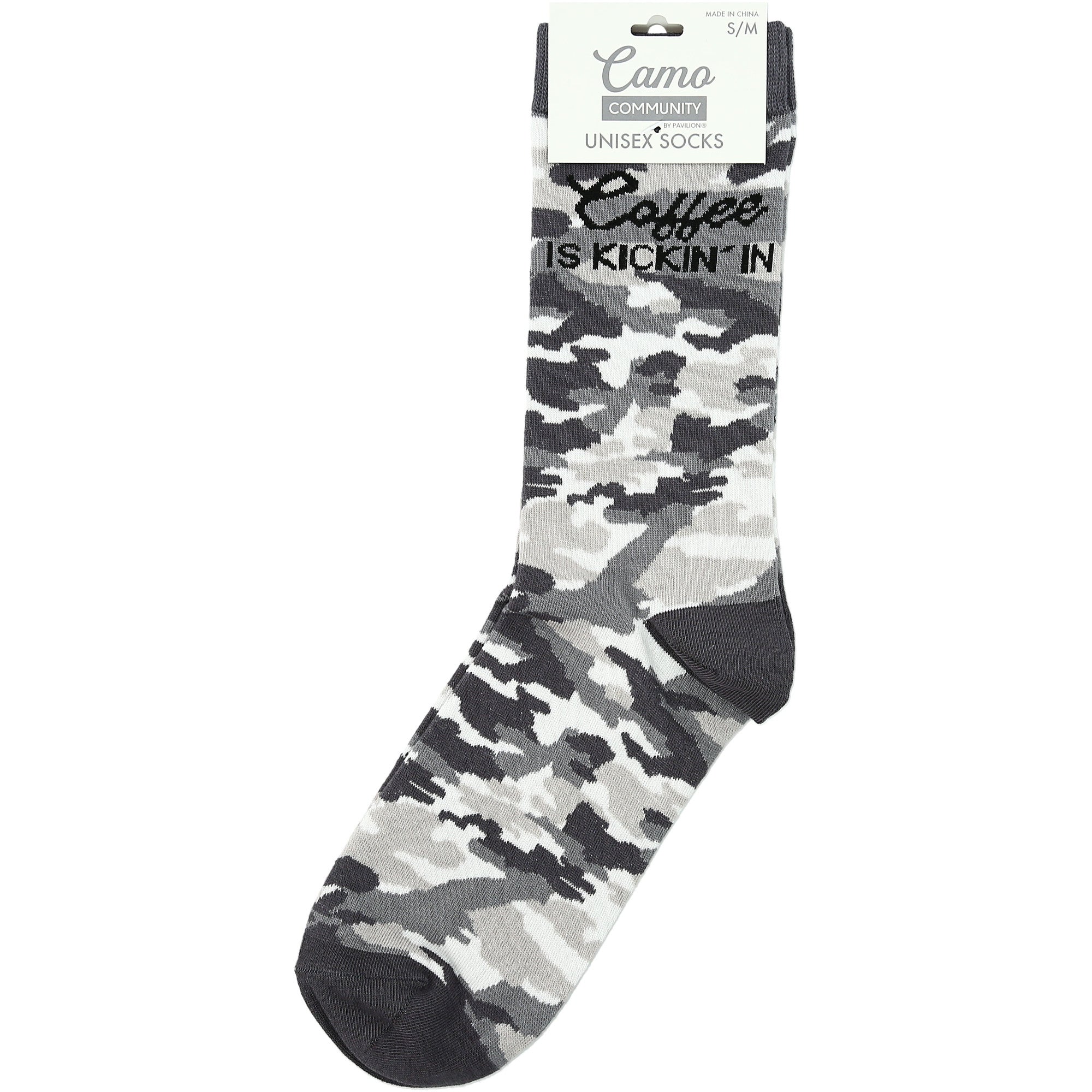 - IN-HOUSE DESIGN: "If You Can Read This More Coffee Please" text is sewn into the side of the socks with a gray camo pattern that covers all but the heel, ankle and toe which are solid.