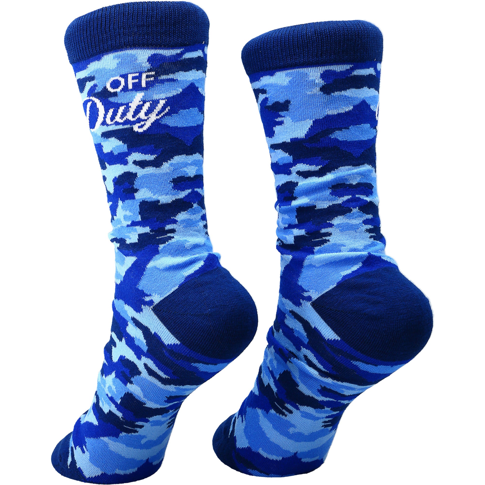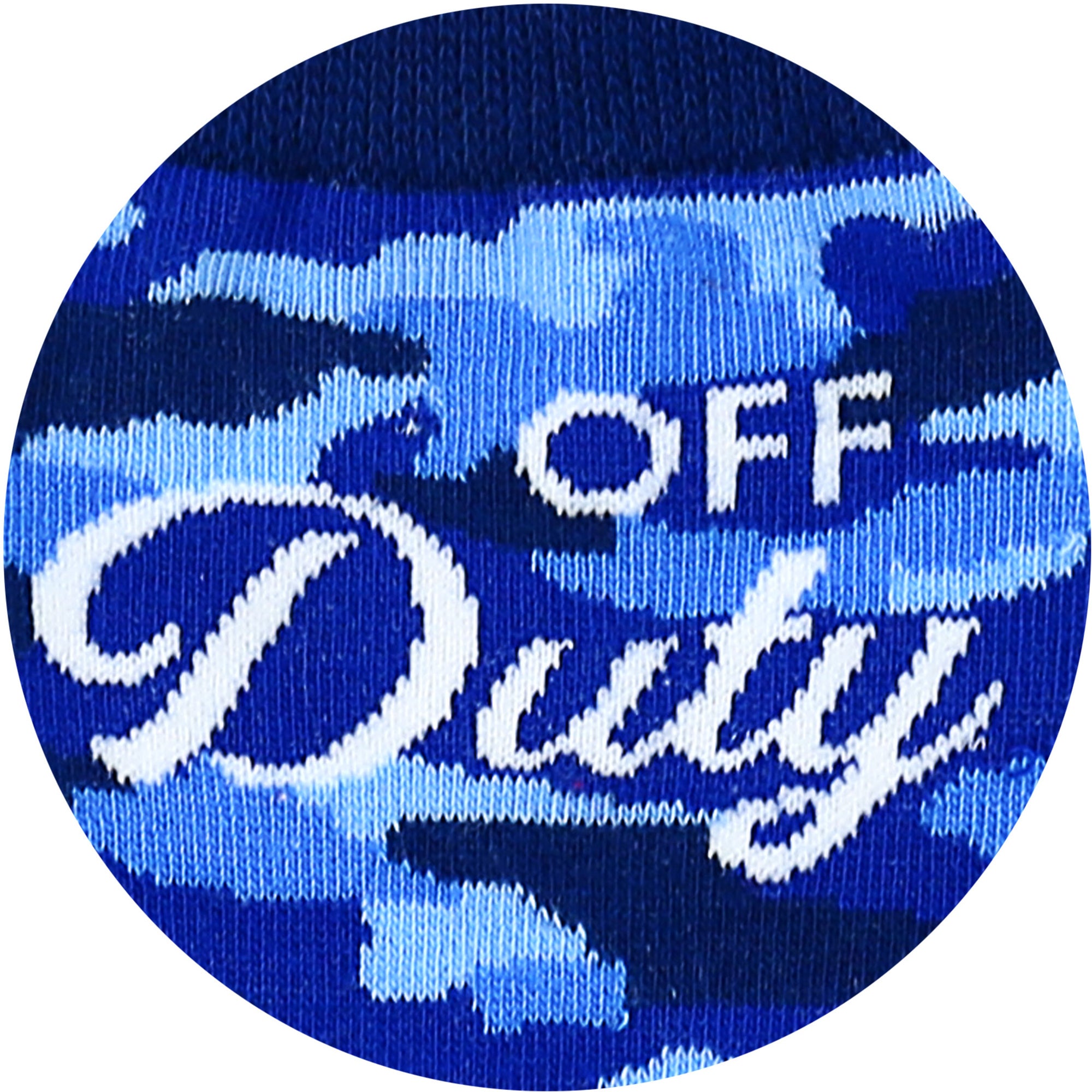 - IN-HOUSE DESIGN: "Off Duty" text is sewn into the side of the socks with a blue camo pattern that covers all but the heel, ankle and toe which are solid.