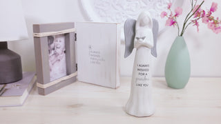 • PREMIUM QUALITY: The delicate hallowed interior 9" angel figurine is constructed from terracotta. Her long side parted hair drapes in a v down the center of her back where her gray hand wood carved patterned wings are connected. Her long dress flows seamlessly around the ground. Overall white finish with soft faded gray brushmark strokes for added dimension. She holds her hands towards the right side of her chest with a calm gray butterfly at rest in her palms.