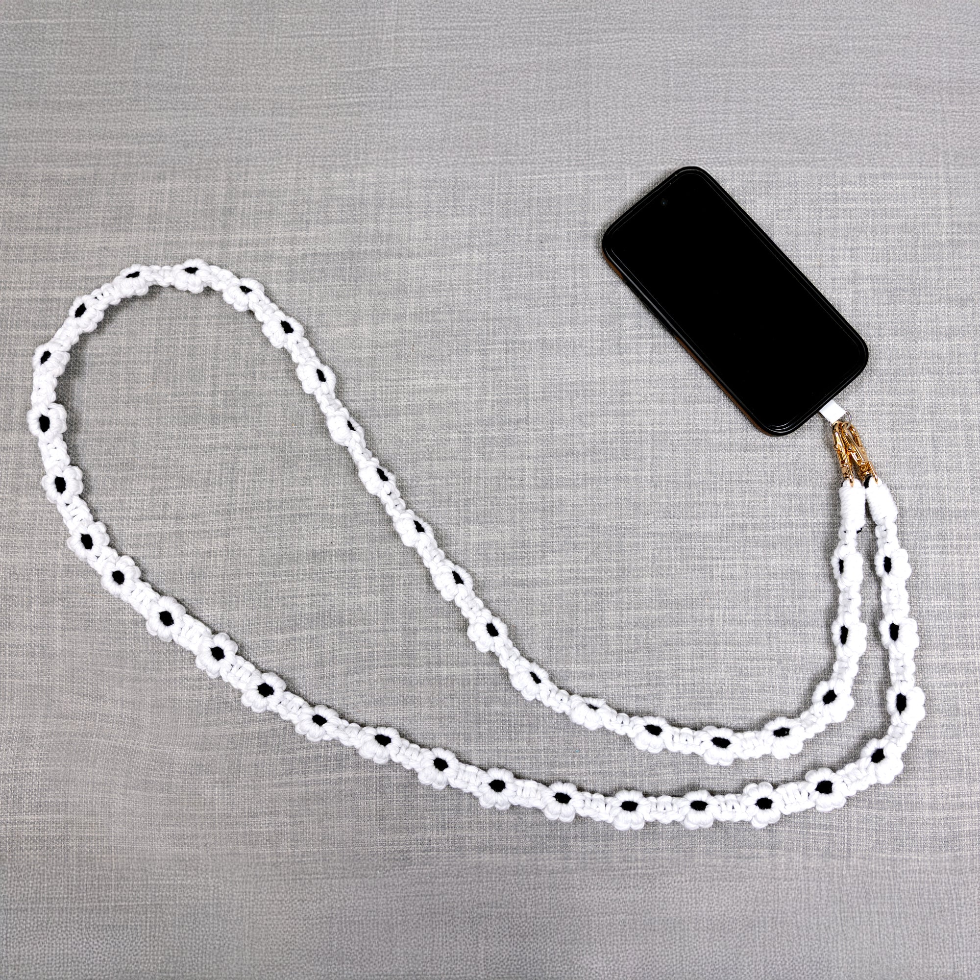 - PREMIUM QUALITY: This 56” woven phone lanyard is crafted from durable, intricately crocheted fabric with an elegant floral pattern, featuring a stylish black and white anemone flower design. The gold-tone metal hardware ensures a secure attachment to your phone, while the lightweight, yet sturdy, woven construction provides a comfortable crossbody wear. Designed for everyday convenience, it’s a chic and practical solution for keeping your phone within reach.