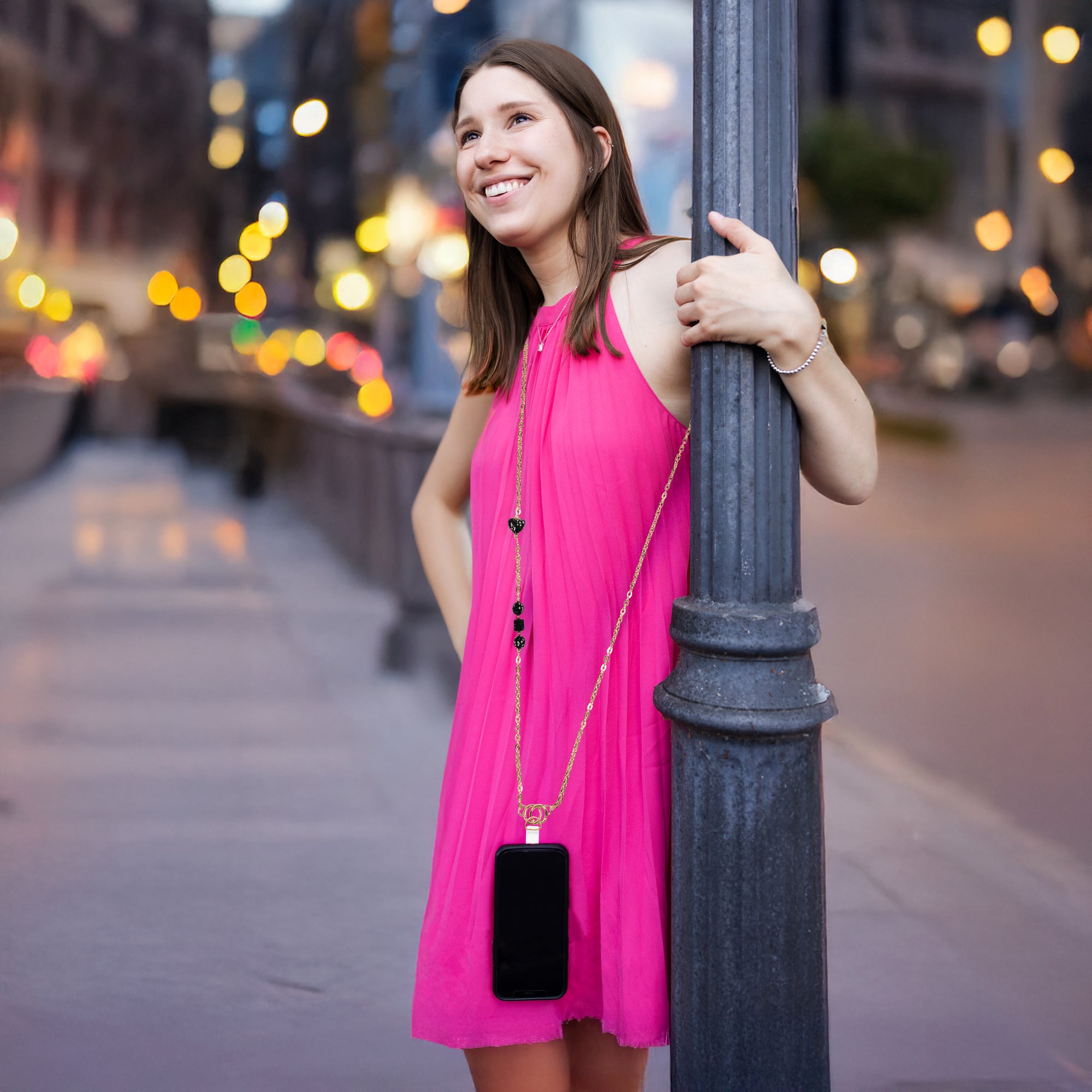 - IN-HOUSE DESIGN: Designed with bold black crystal beads and a sleek gold-tone chain, this crossbody lanyard adds a modern, elegant touch to any outfit. The branded acrylic phone tab makes attachment easy while maintaining a secure fit for most phone cases.