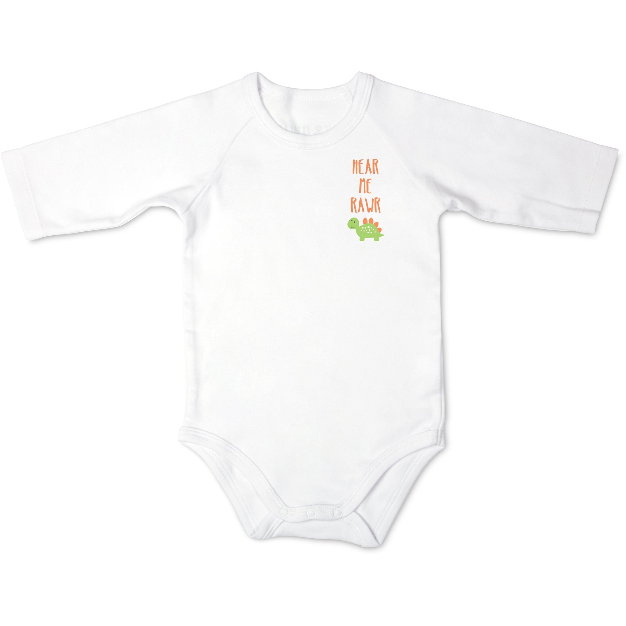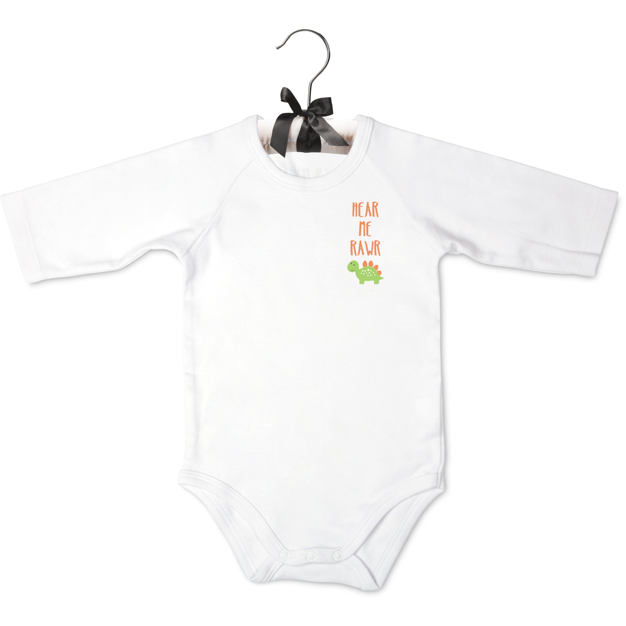 - IN-HOUSE DESIGN: "Hear Me Rawr" text is printed onto the front of the bodysuit, alongside the printed dinosaur image.
