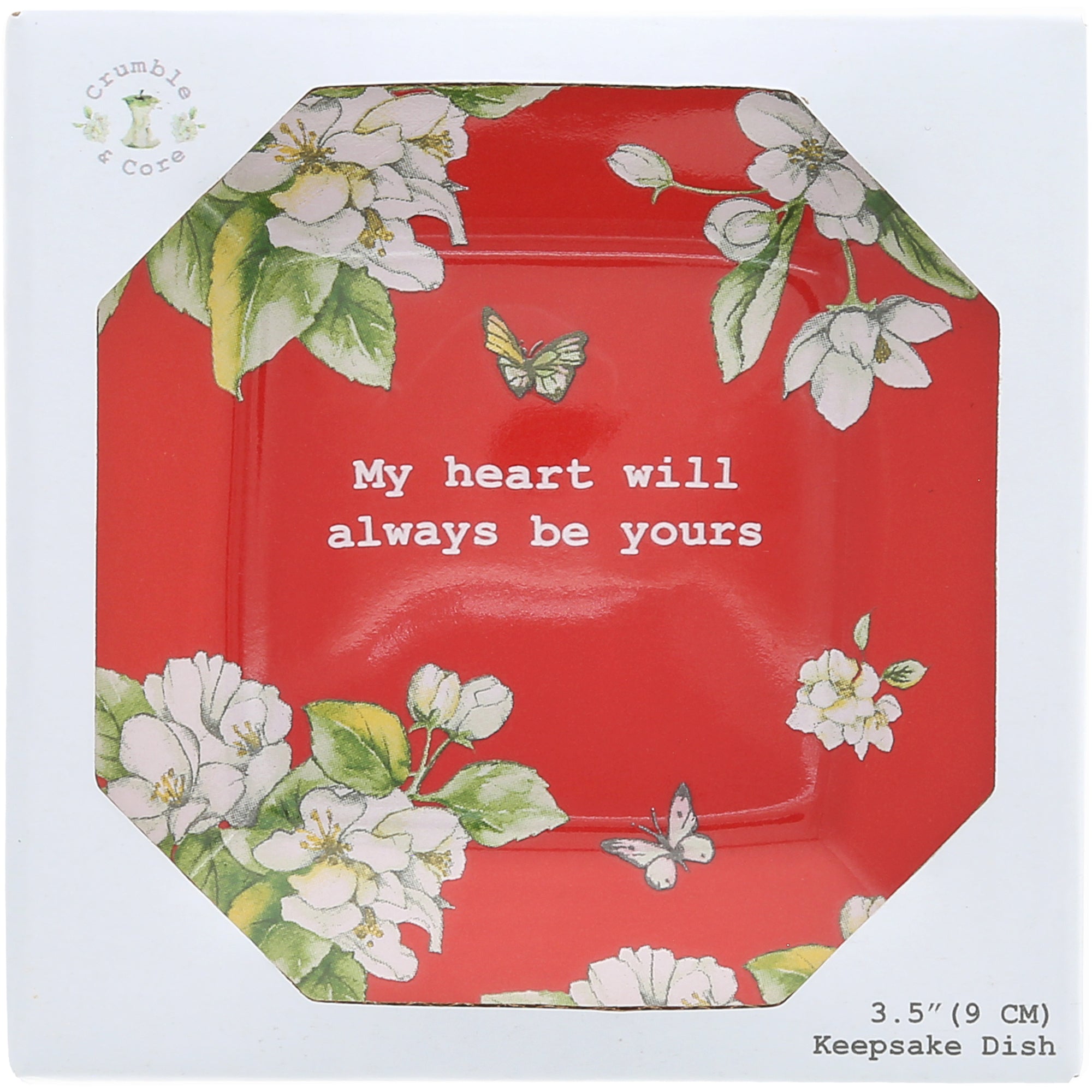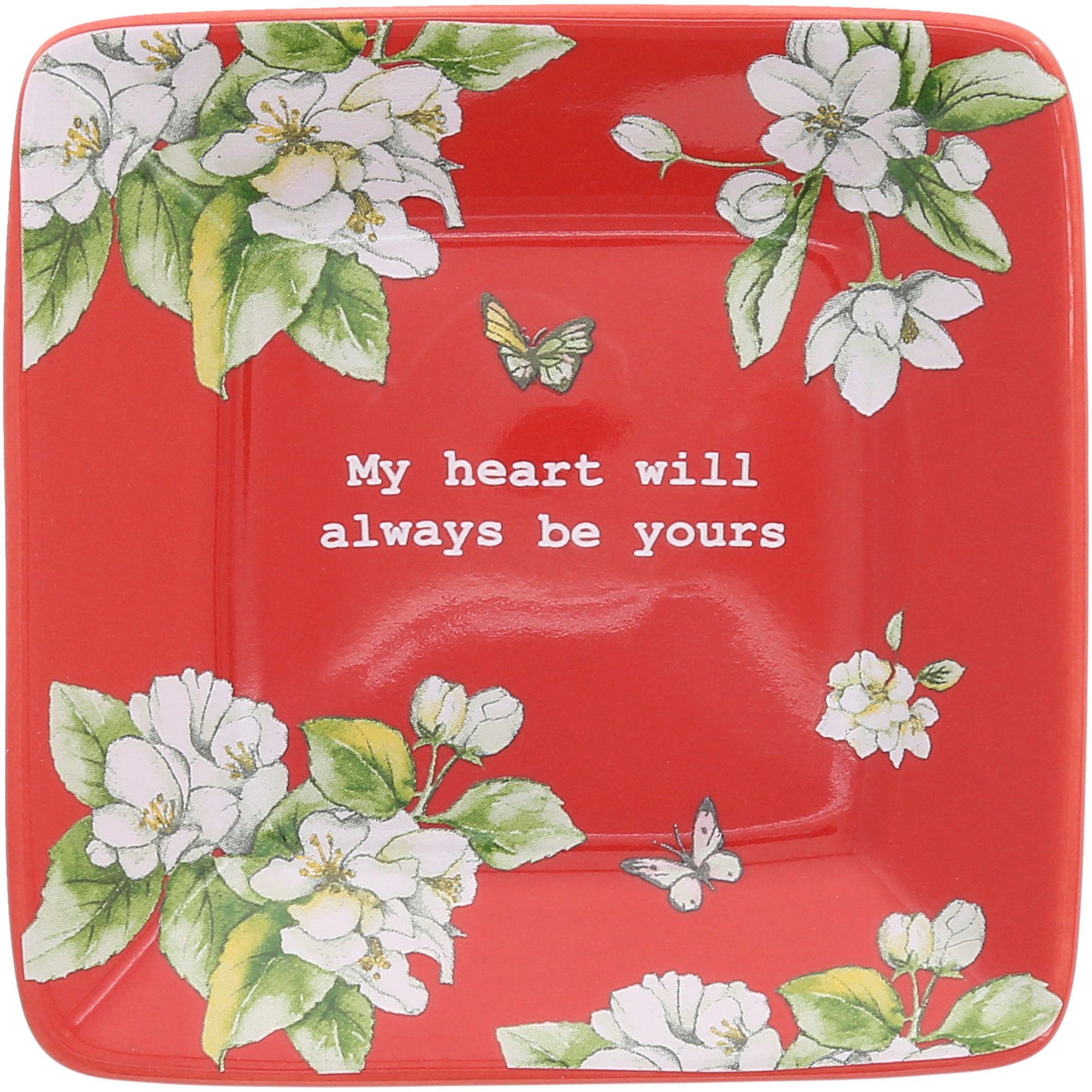 • IN-HOUSE DESIGN: The finish is glossy. The glossy sentiment in the white "My Heart Will Always Be Yours" is placed at the dish's center. The background is red with yellow butterflies and white and greenery floral patterns.