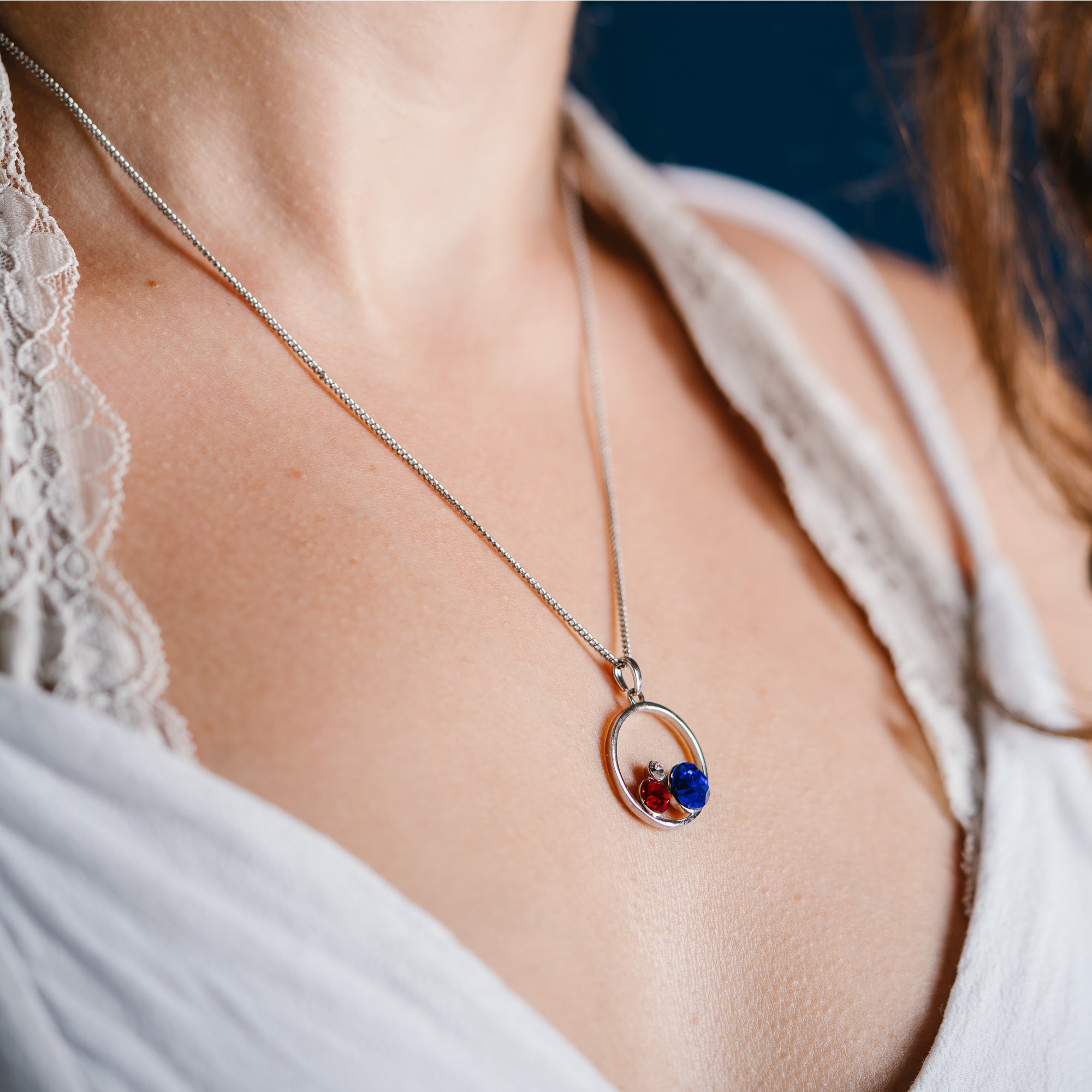 - IN-HOUSE DESIGN: 16-18" necklace with a lobster clasp closure. Necklace contains three crystals embedded in a circular pendant in a bezel setting. Pretty red, white and blue crystals adorn this piece and make it a stunning addition to your jewelry collection.