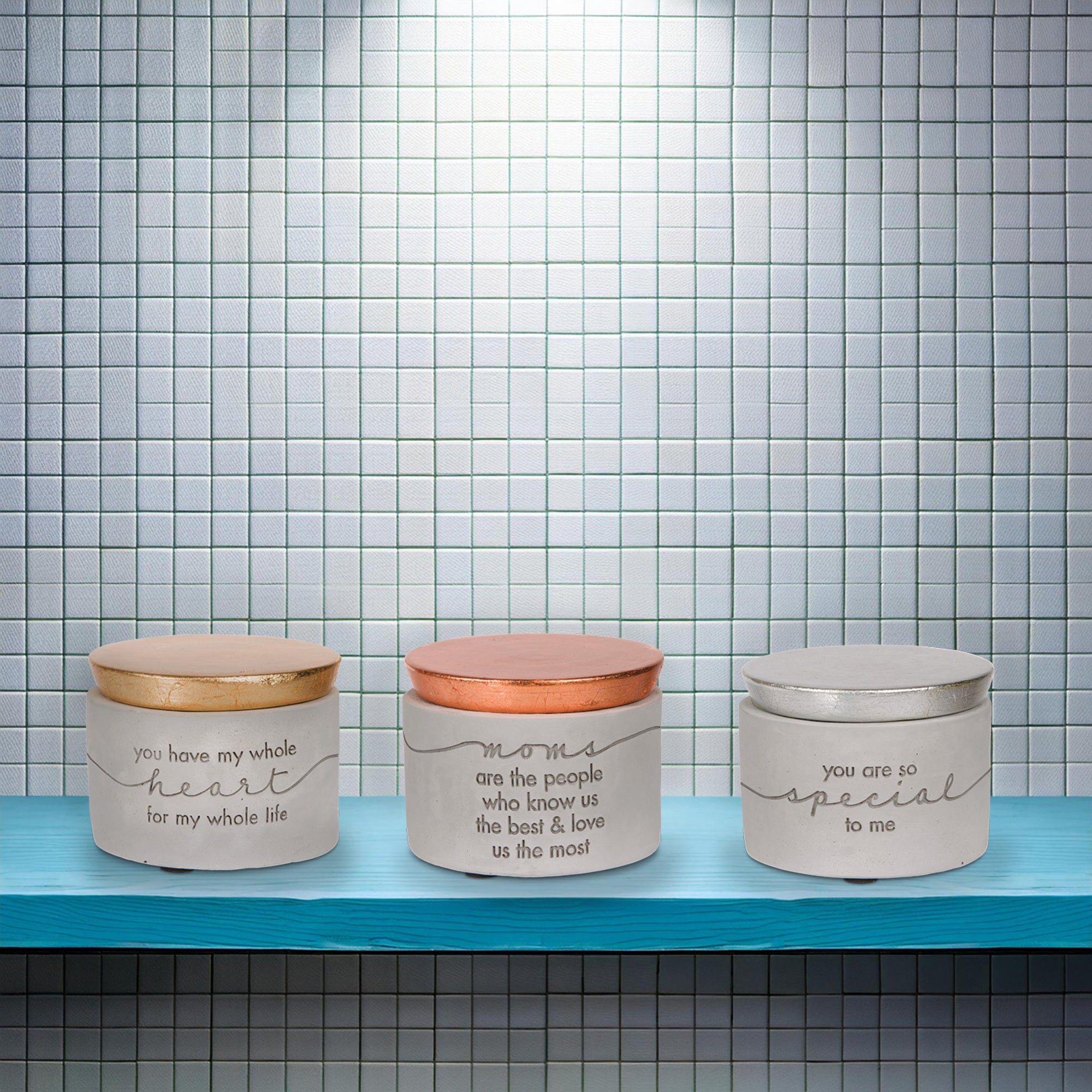 - PREMIUM QUALITY: This compact keepsake box, measuring 3" x 2.25", is made from sturdy cement and finished with a copper-toned lid, combining durability and rustic elegance. Packaged in a printed box, ready for gifting.
