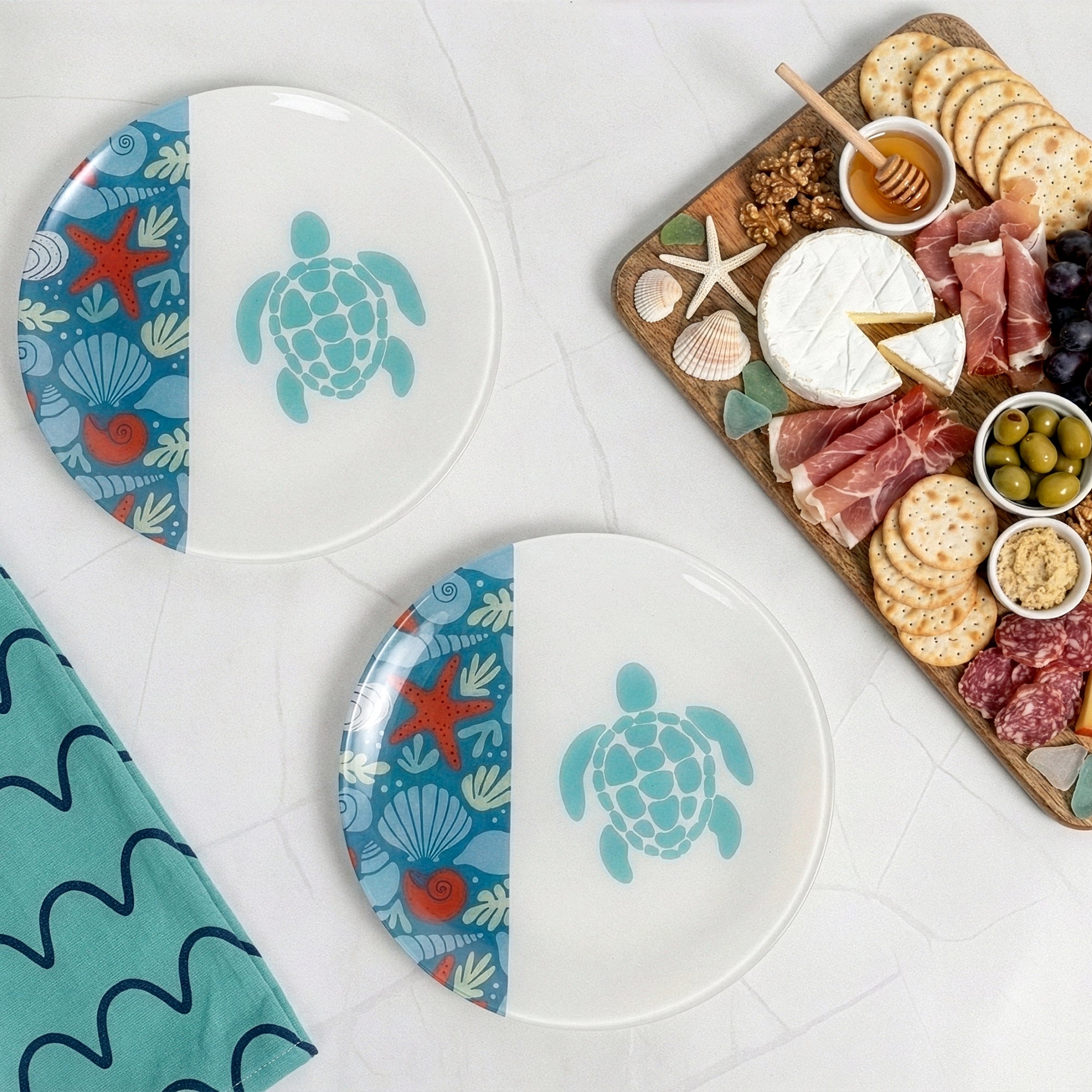 - IN-HOUSE DESIGN: Features Jennifer Smelker’s signature coastal artwork: one half of each plate showcases sea turtles, coral, shells, and seaweed in vibrant teal, coral, and seafoam tones, balanced by a clean white half with a centered sea turtle motif. Artwork is permanently fused to the underside of the glass to prevent scratching and preserve color brilliance.
