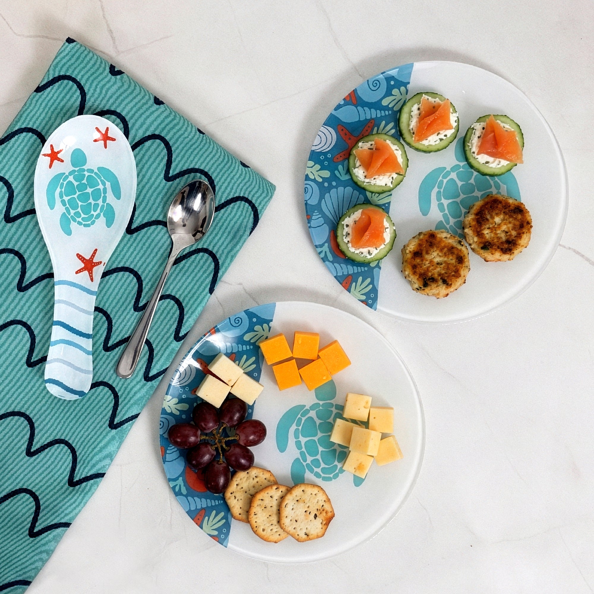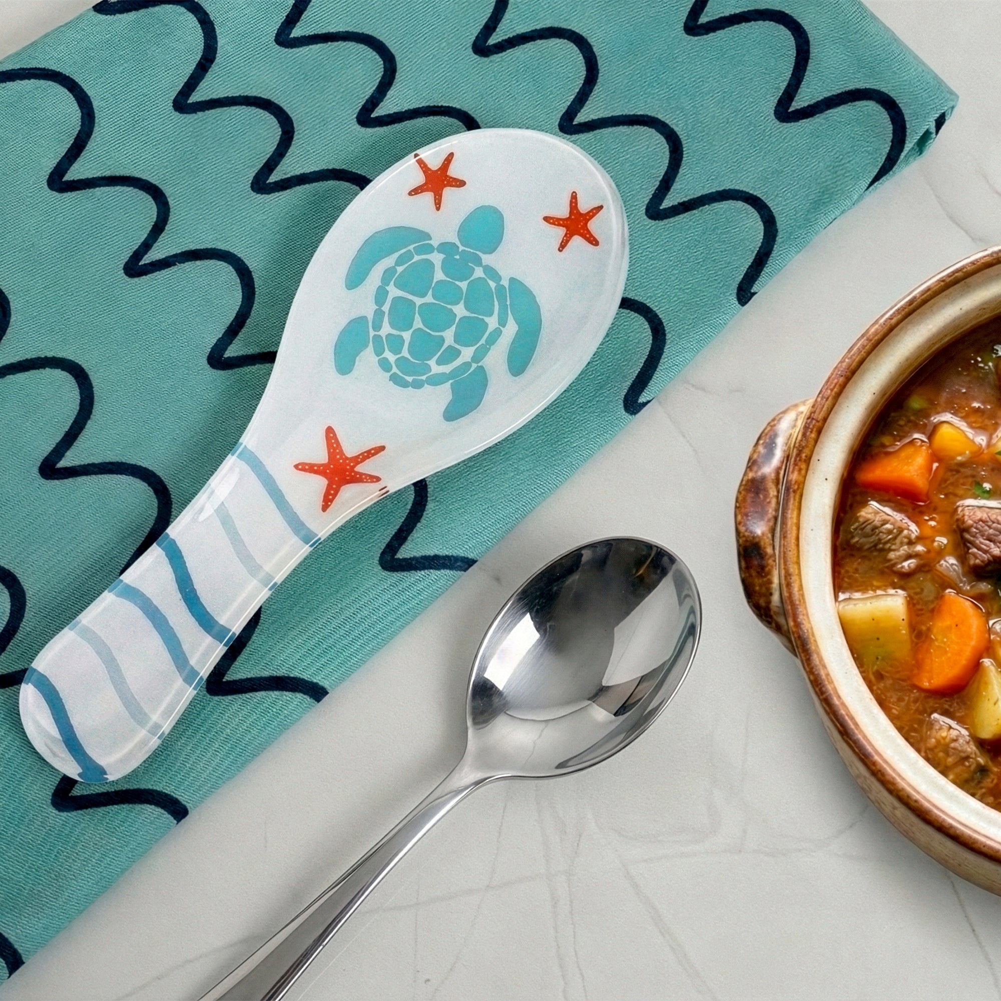 - IN-HOUSE DESIGN: Features exclusive coastal artwork by Jennifer Smelker, including a sea turtle, starfish, and soft ocean waves in teal, coral, and seafoam hues. Printed on the underside of the glass to preserve color vibrancy and prevent scratching during use. A curved resting surface supports spoons, spatulas, and cooking utensils securely.