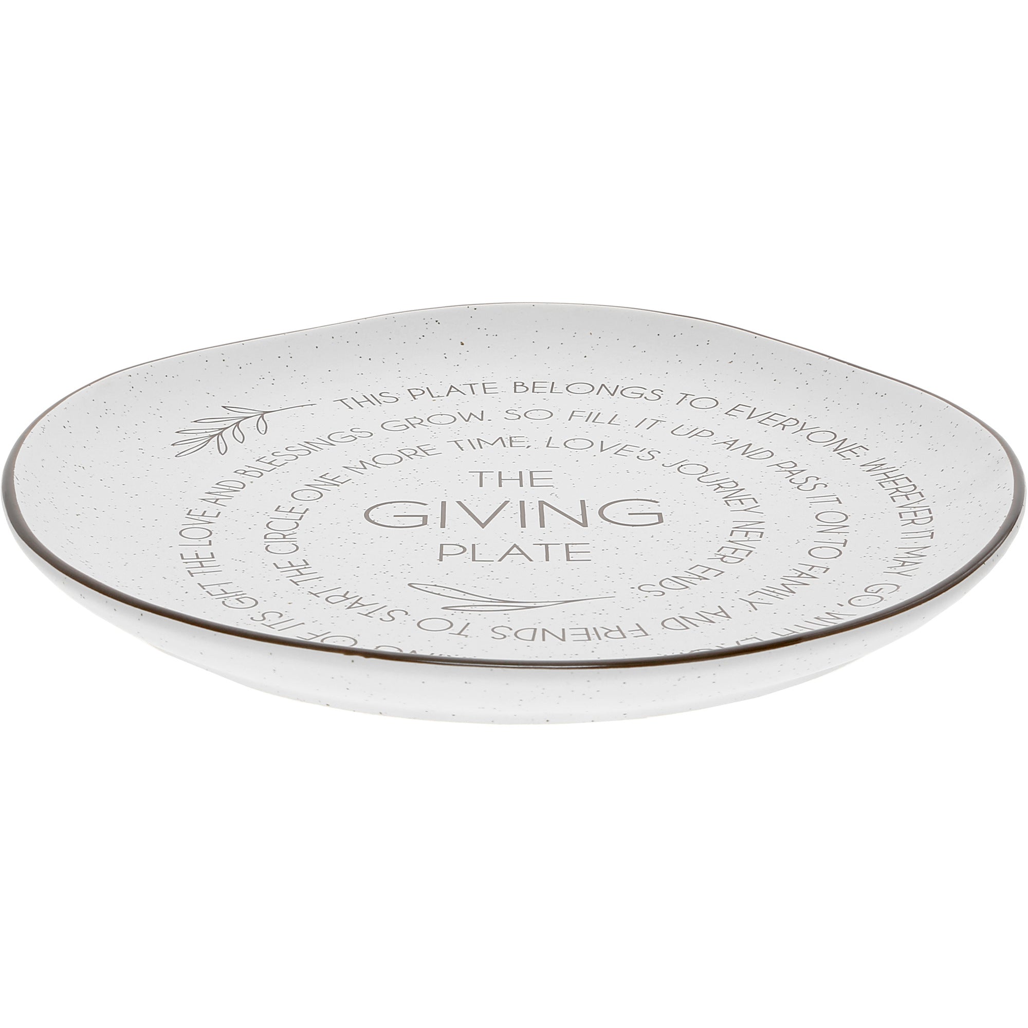 - IN-HOUSE DESIGN: "This Plate Belongs To Everyone; Wherever It May Go, With Each New Sharing Of Its Gift The Love And Blessings Grow. So Fill It Up And Pass It On To Family And Friends To Start The Circle One More Time; Love's Journey Never Ends. The Giving Plate" brown sentiment spirals in a circular motion around the plate's surface, accompanied by leaves, a brown outline, and a brown polka dot pattern. This plate can also be displayed in a cabinet, on a shelf, or on a stand for all to see the loving message year round.
