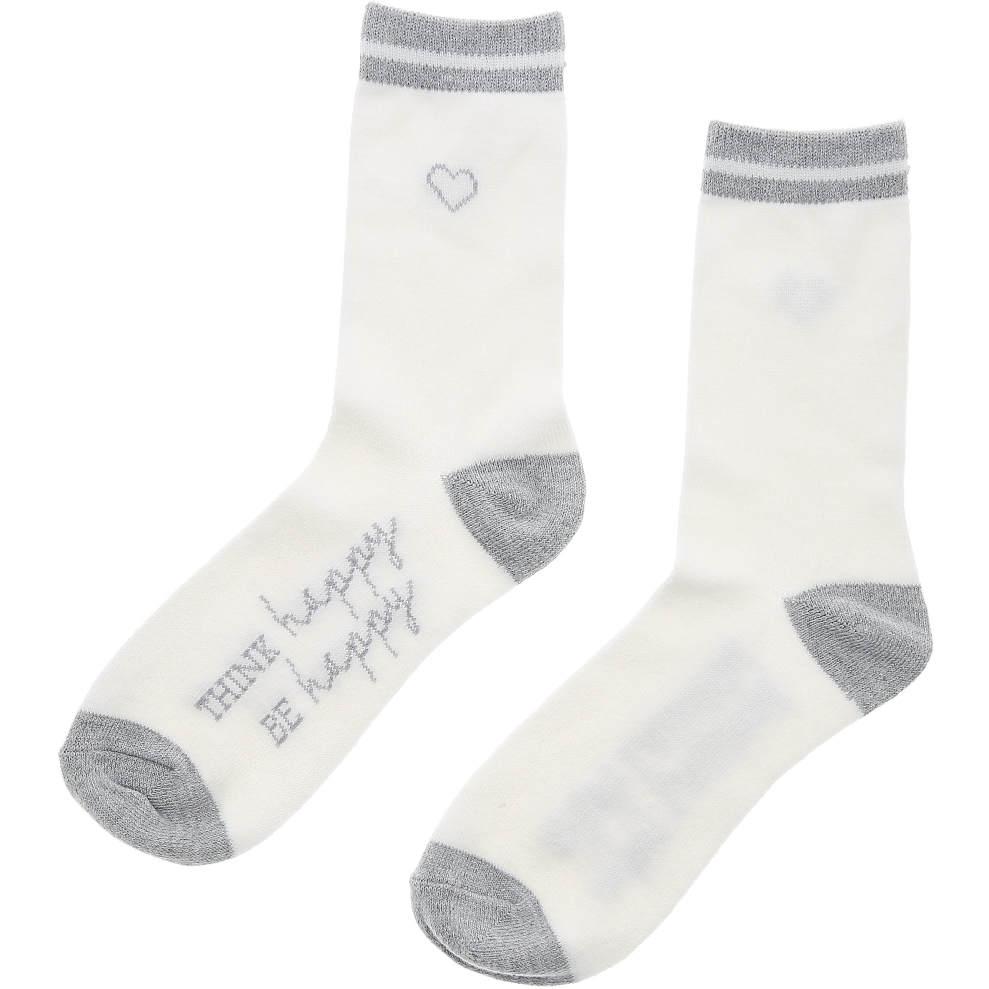 - IN-HOUSE DESIGN: The crew socks have a gray ankle, toe & heel with a cream body and a gray "Think Happy Be Happy" sentiment on the outer lateral of the boot socks. In addition, a small gray-outlined heart is right at the ankle below the striped top. This design reflects on the exterior of each hose.