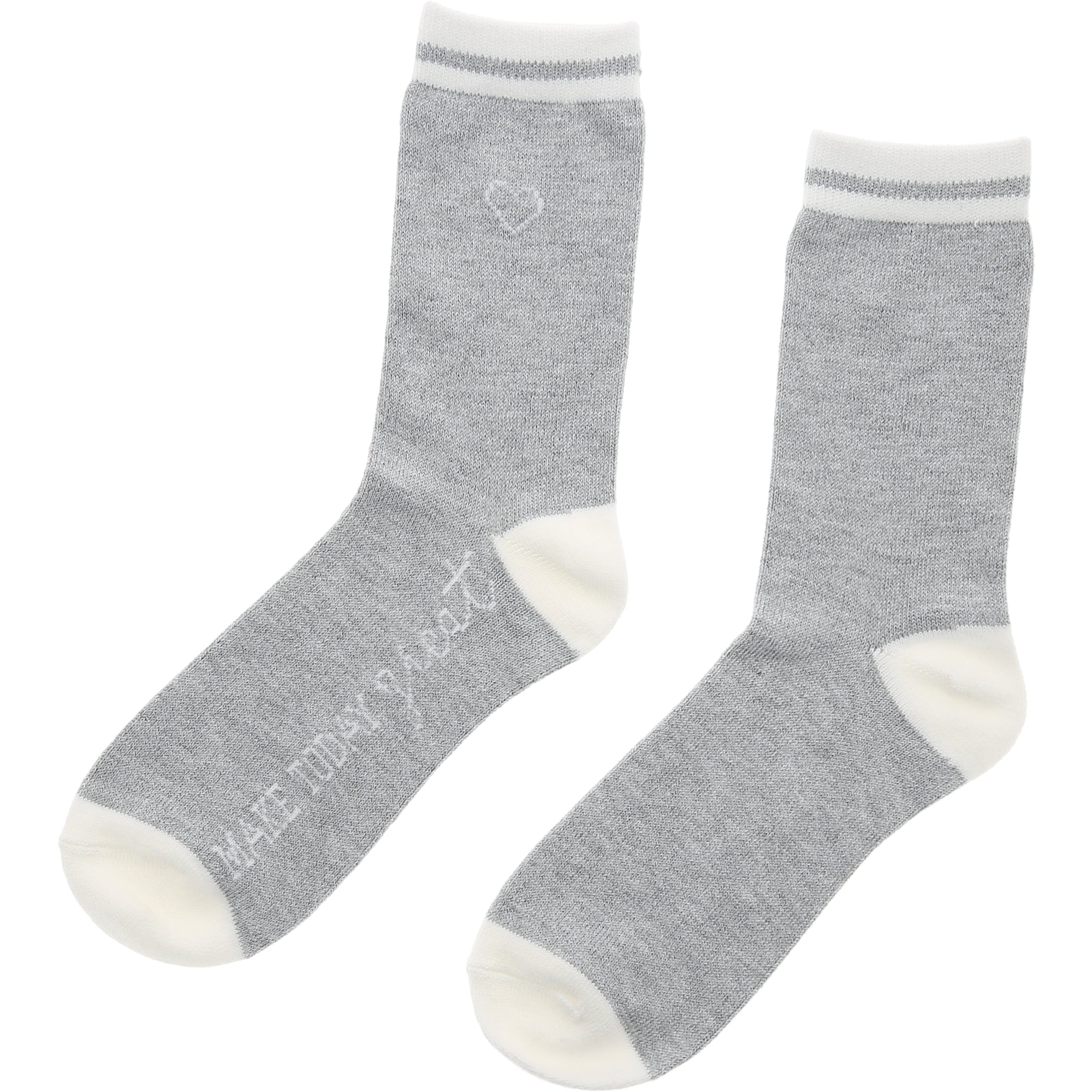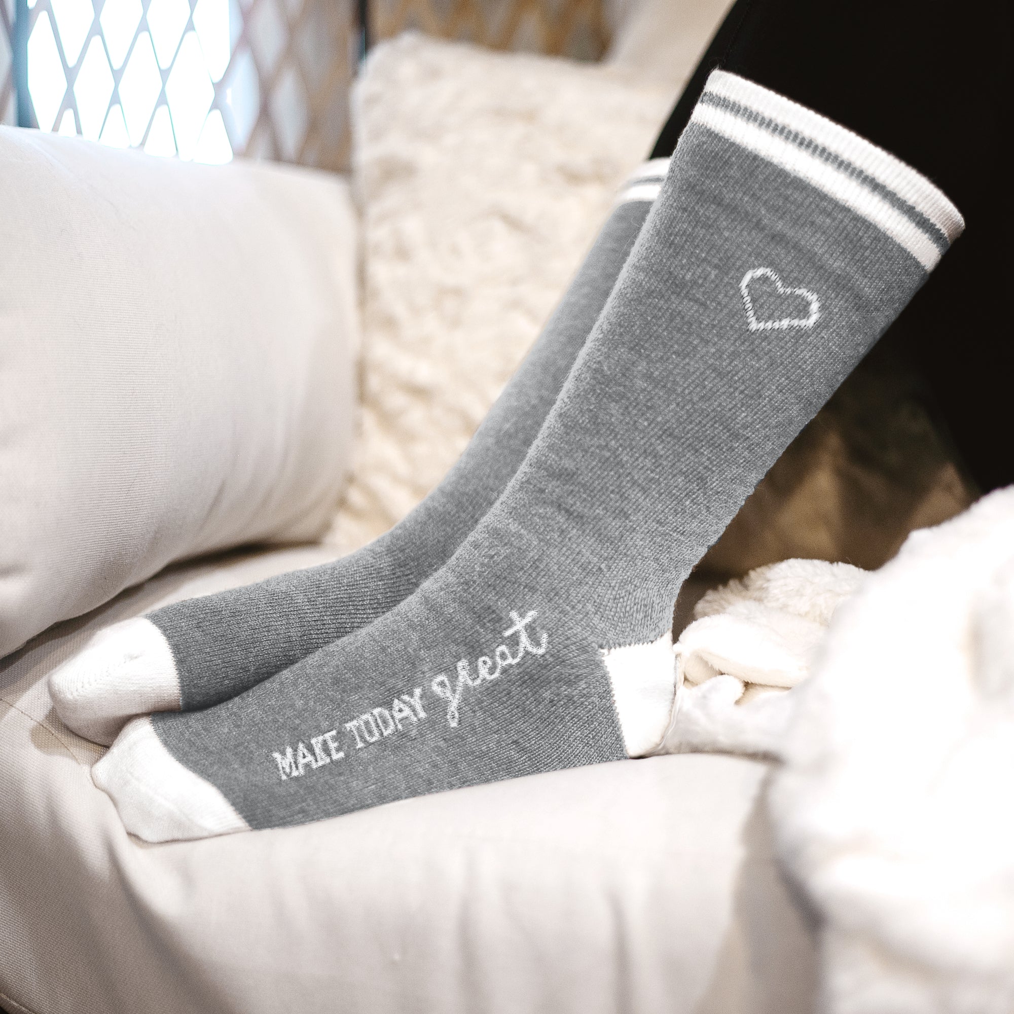 - IN-HOUSE DESIGN: The crew socks have a cream ankle, toe & heel with a gray body and a cream "Make Today Great" sentiment on the outer lateral of the boot socks. In addition, a small cream-outlined heart is right at the ankle below the striped top. This design reflects on the exterior of each hose.