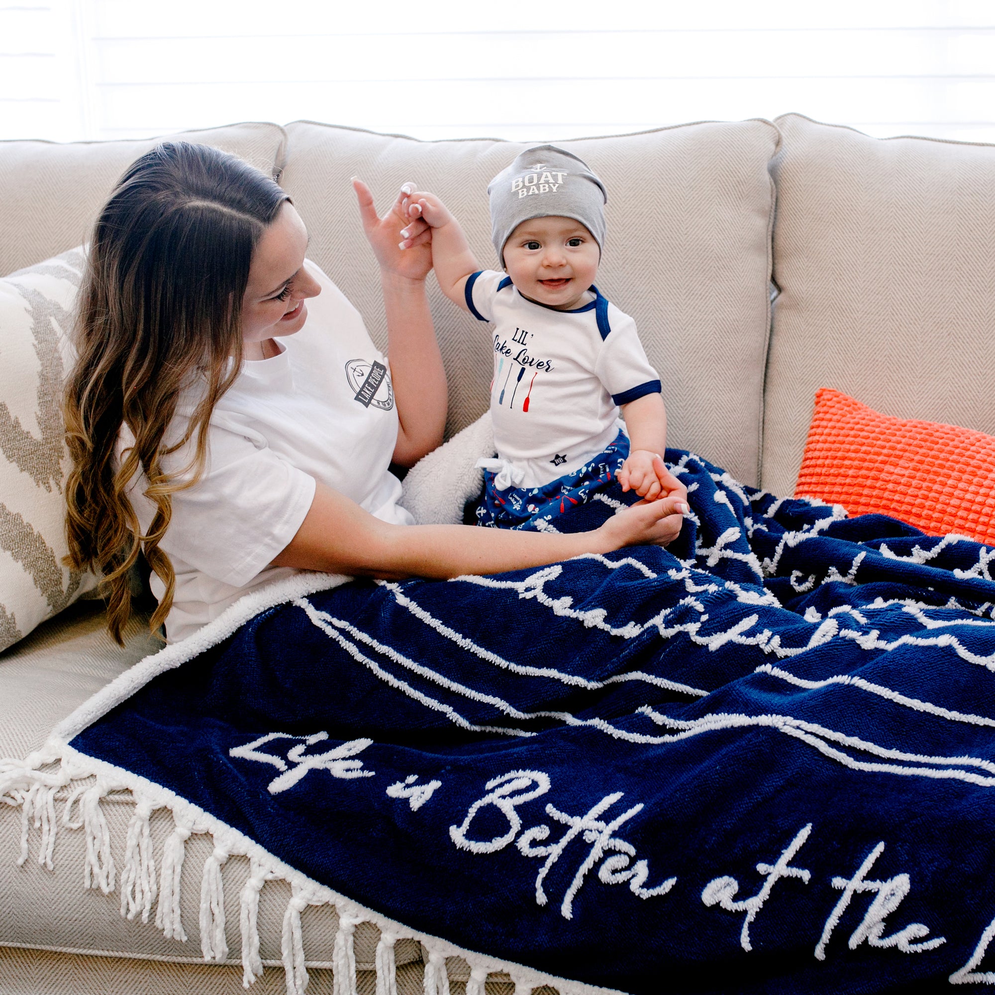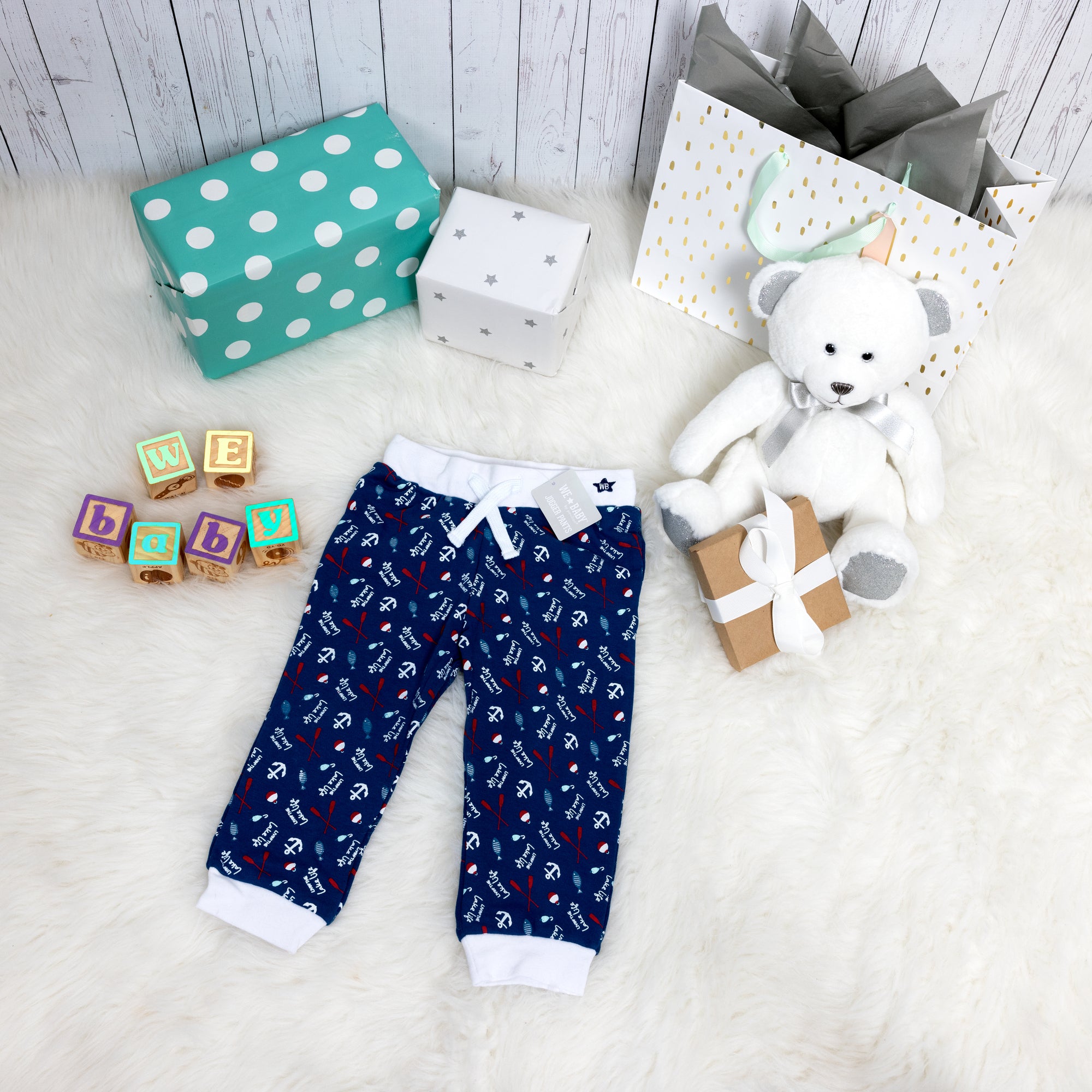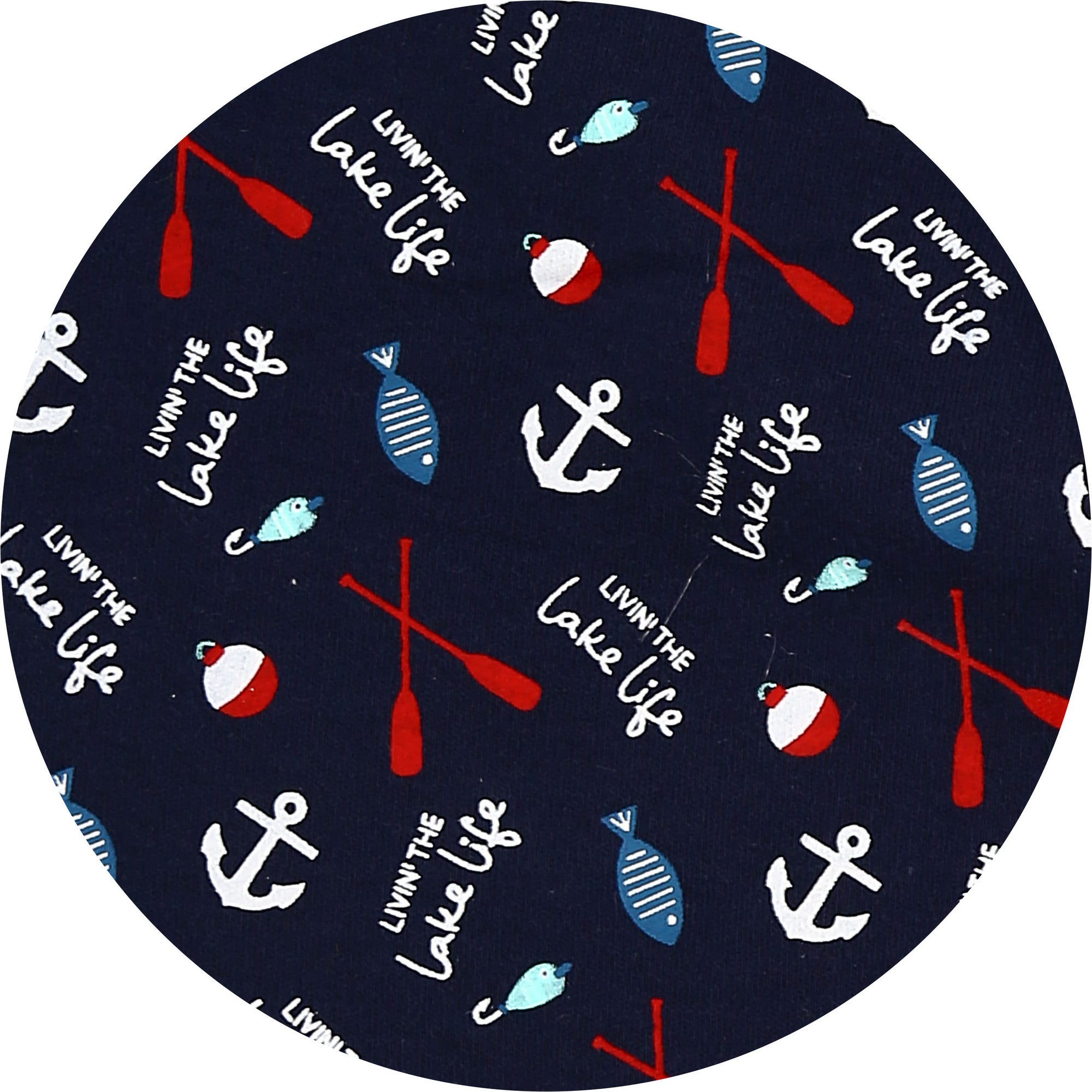 - IN-HOUSE DESIGN: The waistband has a star-shaped embroidered WB background. The white/red bobbers, blue fish hooks, white anchors, red oars, and blue fish patterns are accompanied by a repeating "Livin' The Lake Life" white sentiment.