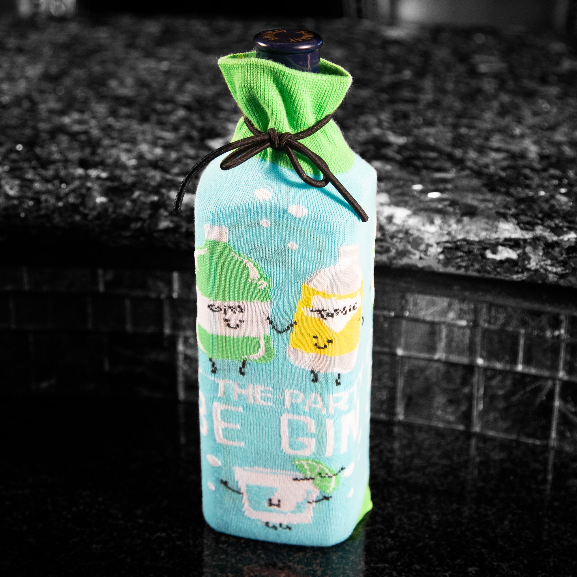 - IN-HOUSE DESIGN: "Let The Party Be Gin" text and accompanying gin and tonic bottle icon are sewn into both sides of the bottle bag.