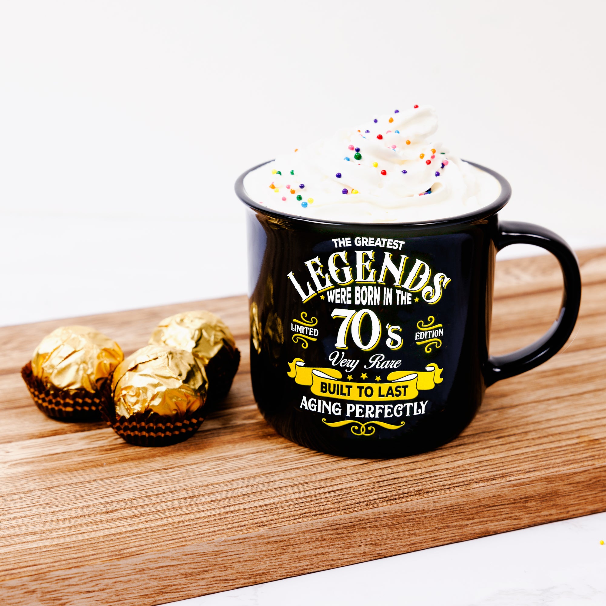 - IN-HOUSE DESIGN: "The Greatest Legends Were Born In The 70s, Limited Edition, Very Rare, Built To Last, Aging Perfectly" decal is in full caps, black and white, with multi-directional lines of words intertwined with yellow swirls and banners which stand out on the stark black exterior. The bright yellow interior has a black "Legends Of This World" logo on the interior only when the handle is facing to the right side only.