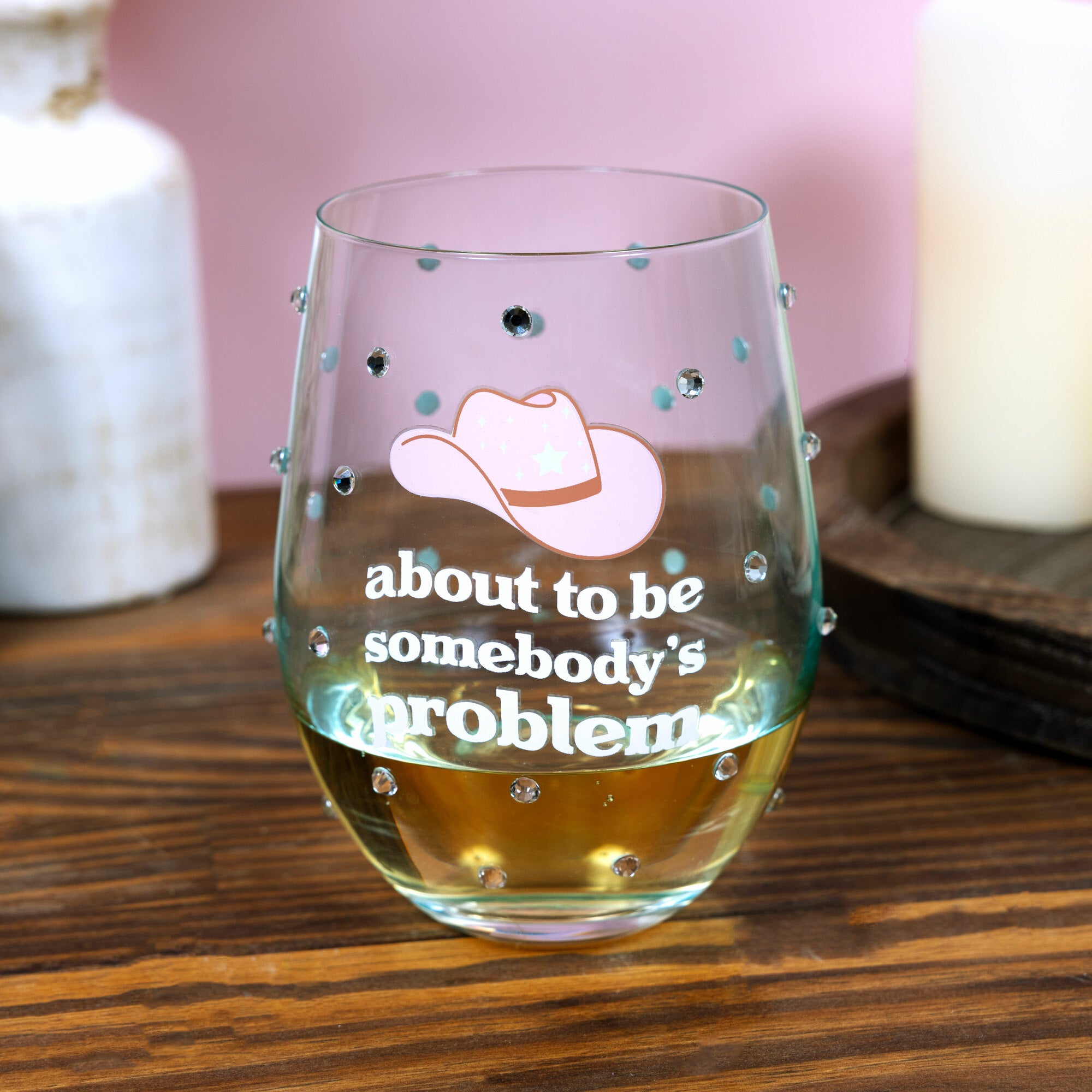 - IN-HOUSE DESIGN: Aqua-tinted glass is paired with a darling pink cowgirl hat graphic and the bold phrase “about to be somebody’s problem”—a playful, flirty, and fun sentiment perfect for nights out or girls’ trips. Scattered gemstone accents add shine and dimension. Packaged in a custom printed gift box with coordinating boots-and-stars design for a polished, ready-to-gift feel.