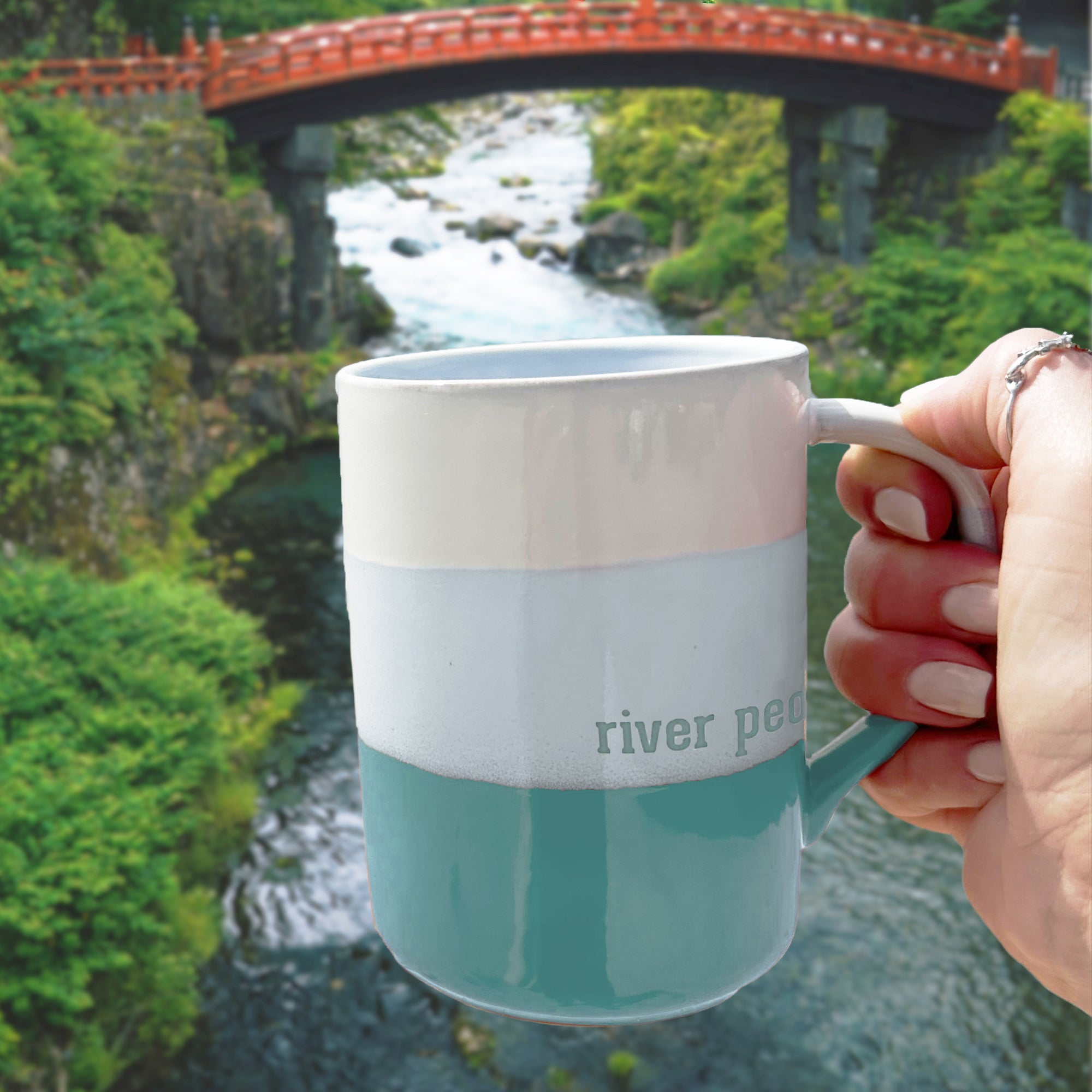 - IN-HOUSE DESIGN: The coffee cup features a triple-tone white, light teal & dark teal striped reactive glaze pattern accompanied by a "River People" teal sentiment in the front center towards the handle. Additionally, a unique teal silhouette canoe with oars at the bottom interior of the mug is revealed as you drink your favorite coffee, tea, or other beverage.