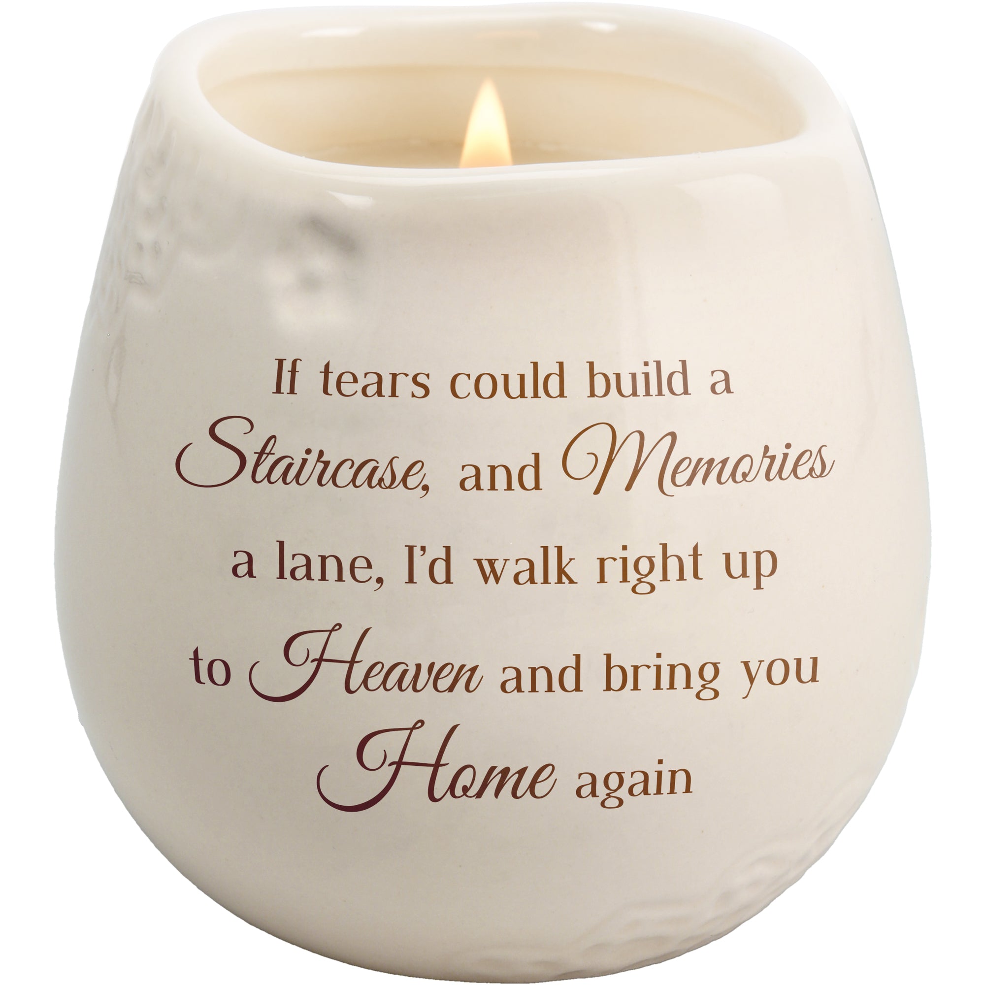 - IN-HOUSE DESIGN: "If tears could build da staircase, and memories a lane, I'd walk right up to Heaven and bring you home again," text is printed onto the front of the candle holder.