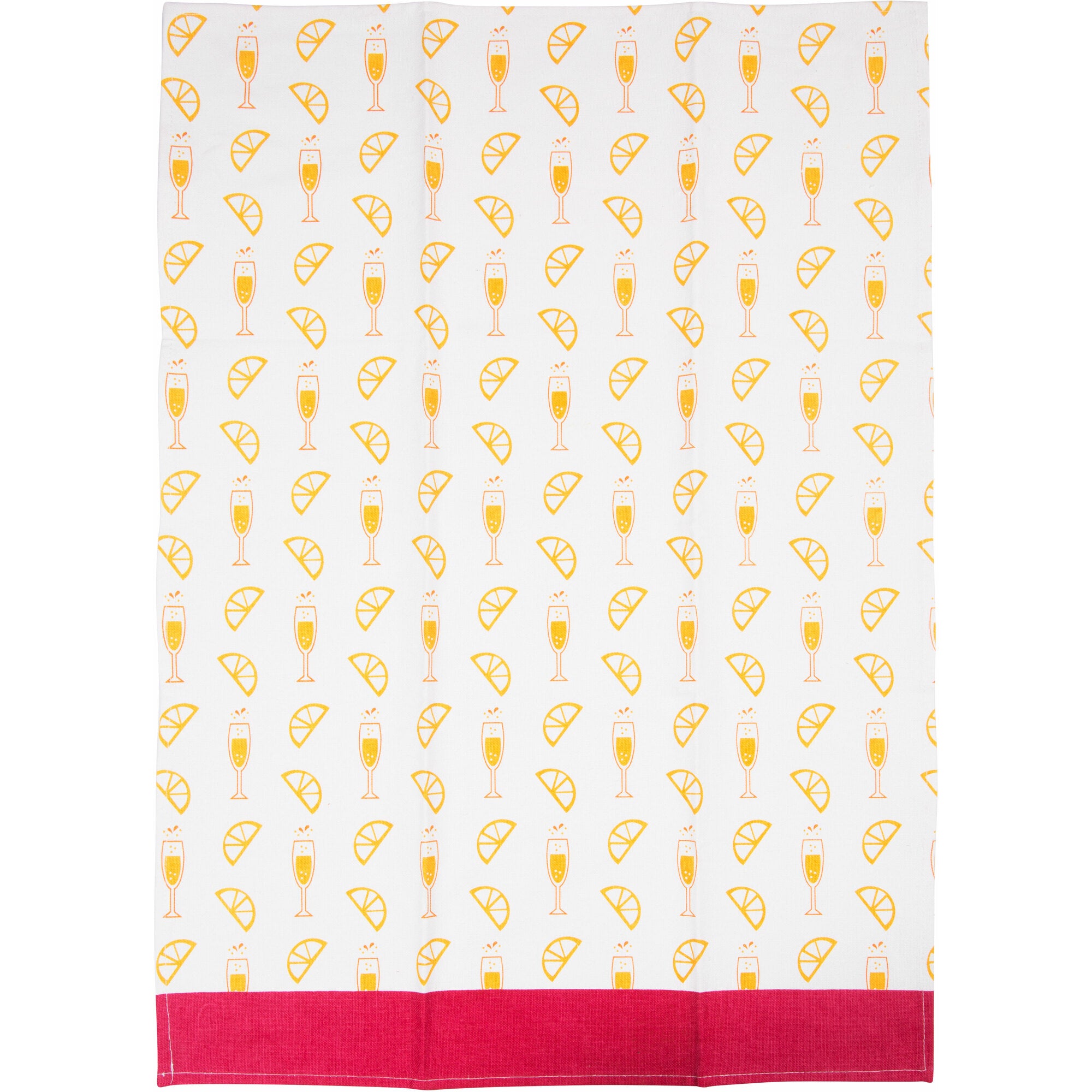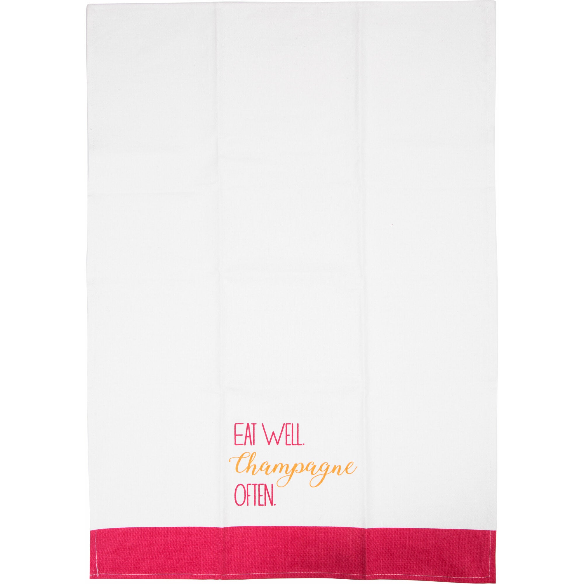 - IN-HOUSE DESIGN: "Eat Wek. Champagne Often." text is printed onto the front of one tea towel and a lemon wedge and champagne flute pattern is printed onto the other.