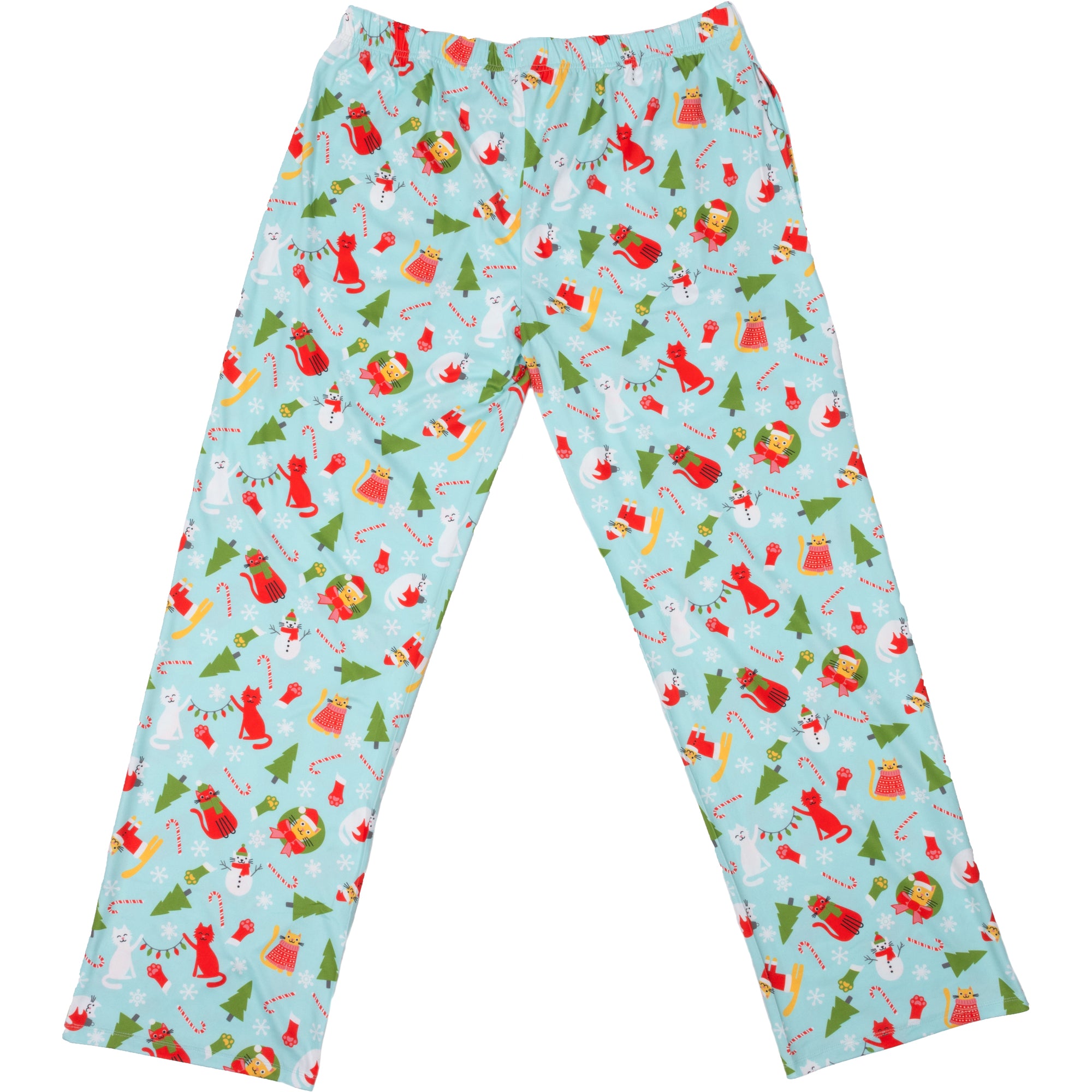 - IN-HOUSE DESIGN: Festive cat-themed patterns showcasing holiday red, yellow, and white kittens and felines with wreaths, pine trees, snowflakes, knit sweatshirts, stockings, Santa hats, cat-shaped snowmen, candy canes, and string lights on a light blue backdrop. Each detail is thoughtfully designed to bring holiday joy to your loungewear collection, making these pants perfect for cozy nights at home or festive gatherings. Our design team ensures a unique look that celebrates cats and the holiday season.