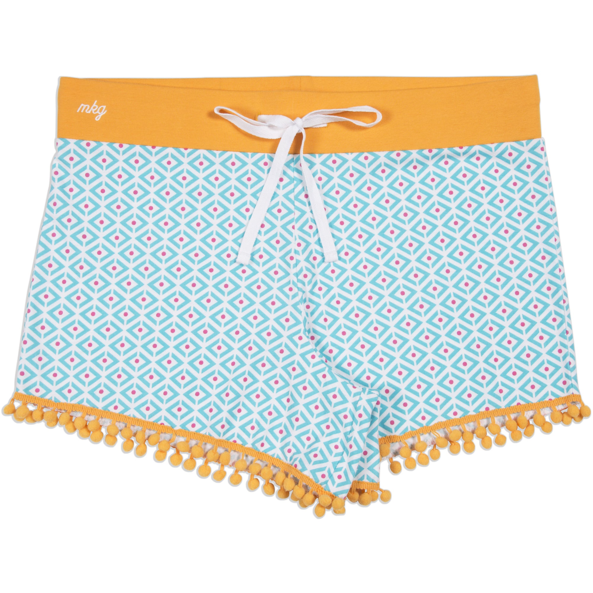• IN-HOUSE DESIGN: "MKG" text is embroidered onto the waistband of the shorts and a geometric pattern and mini pom-pom trim cover the rest of the shorts.
