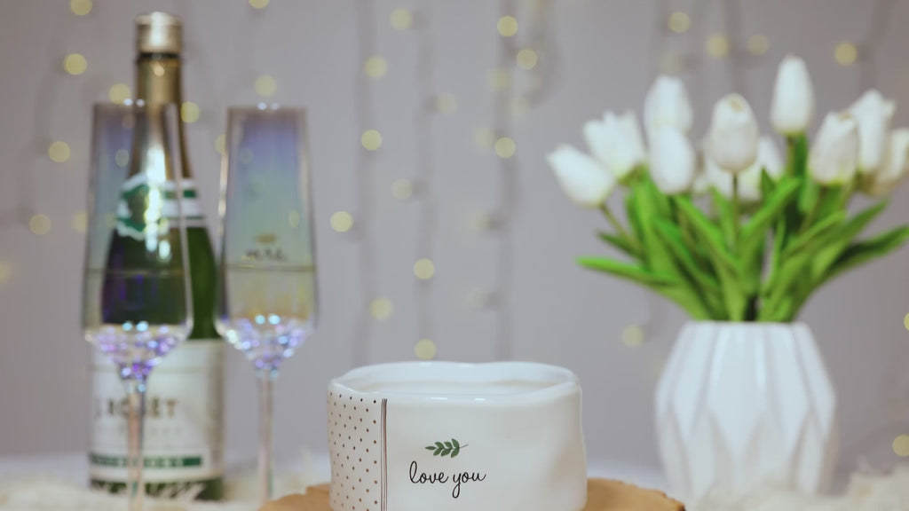 - IN-HOUSE DESIGN: The new & innovative candle offers a unique message for your loved one within the wax as time progresses. You will see cursive written "Let Love Grow" sentiment after about 10 minutes. As you watch, the entire decal with an intertwining golden triple-string and leaf design will appear after 60 minutes. Then, the message will hide again and reappear with each burn. The front of the candles has a simplistic "Love You" decal accompanied by leaf and metallic gold polka dot wrap-around patterns on a matte white exterior handmade feel vessel with a glossy interior.