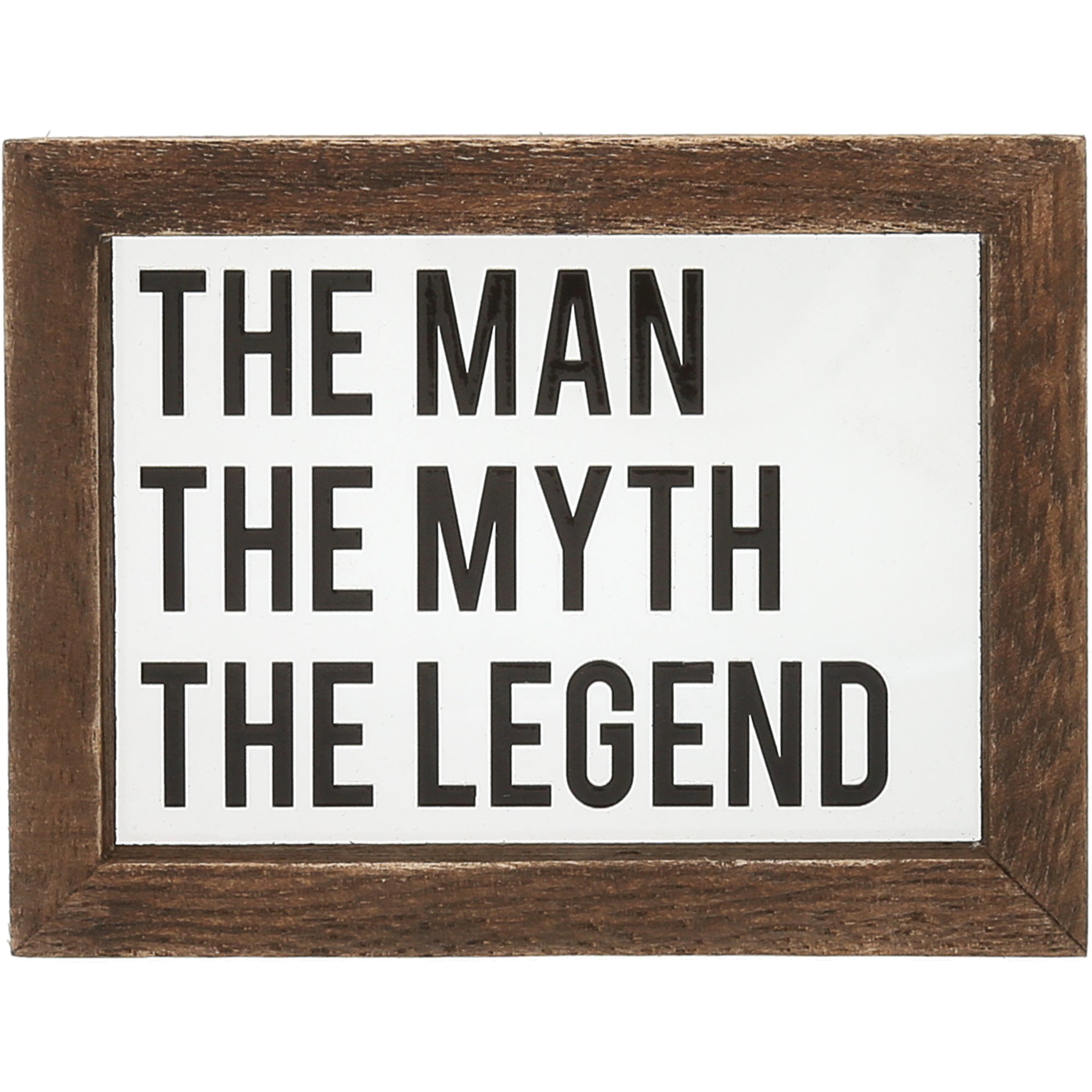 - PREMIUM QUALITY: This 4" x 3" plaque is made with a durable dark wood-stained frame and a glass panel featuring the phrase “The Man The Myth The Legend.” Equipped with a metal sawtooth hanger and freestanding design.