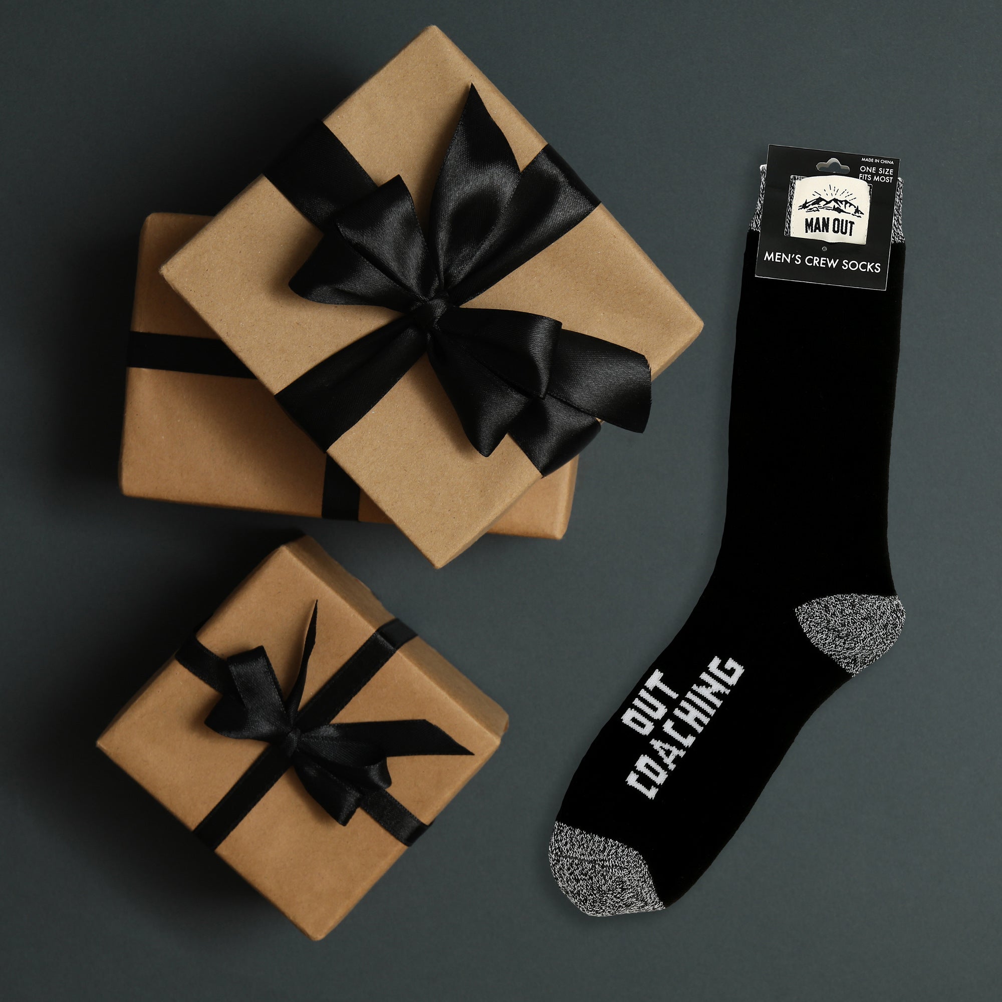 - IN-HOUSE DESIGN: These stylish black crew socks feature a unique heathered gray design at the ankle, heel, and toe, adding a rugged touch to the classic look. The bold, white “Out Coaching” text on the outer edge adds a personalized element, making them perfect for coaches. The ankle is accented with a cream-colored “Man Out” patch, complete with a mountain range design, reinforcing the adventurous spirit of the brand and adding a rustic charm that resonates with outdoor enthusiasts and sports lovers.
