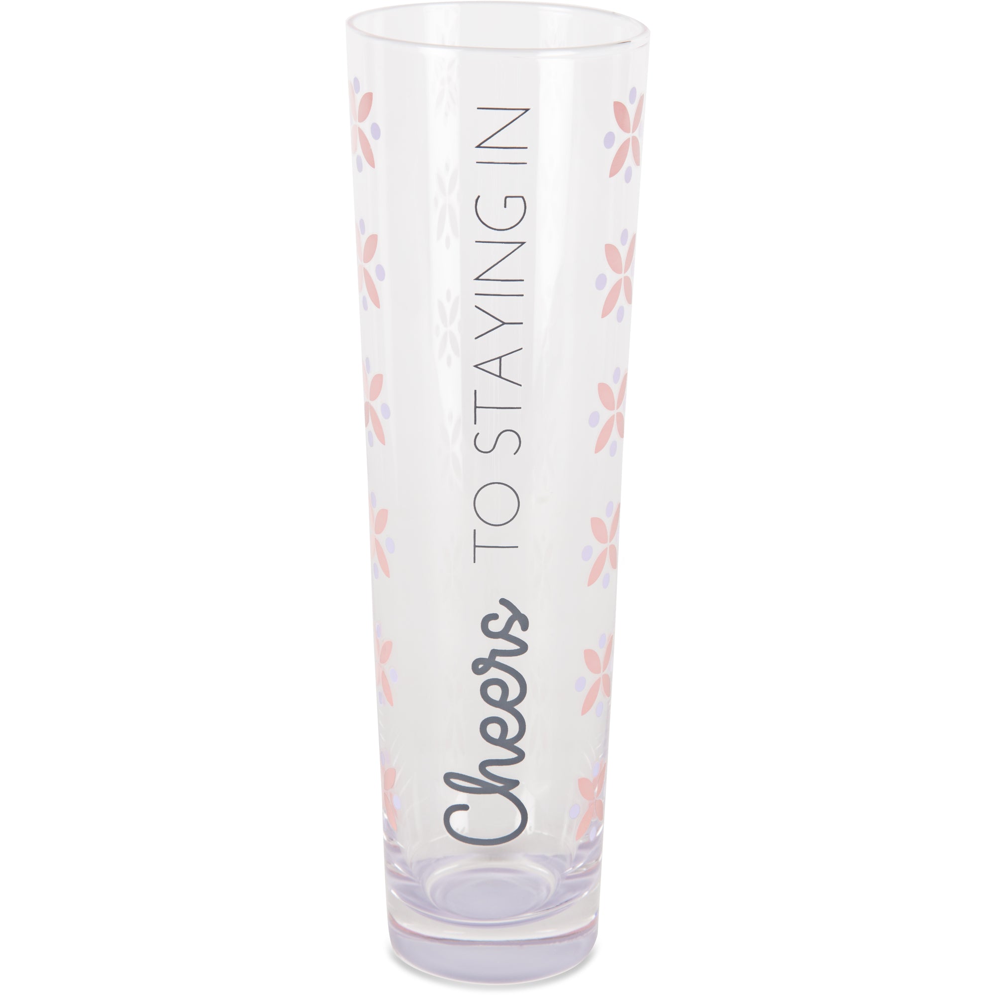 - IN-HOUSE DESIGN: The flute features the fun and relatable phrase "Cheers to Staying In" printed in a stylish mix of script and block lettering, ensuring a modern and trendy aesthetic. Surrounding the text are soft peachy-pink floral accents that create a delicate, feminine touch. The lavender-tinted base adds a subtle pop of color, making the design feel sophisticated, yet cozy and inviting.