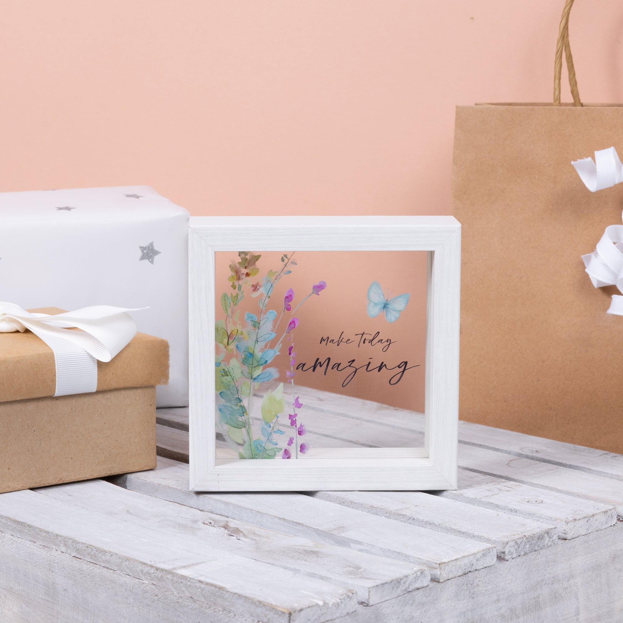 - IN-HOUSE DESIGN: Green, blue, and purple watercolor paint-inspired flowers with a teal butterfly are accompanied by a "Make Today Amazing" sentiment-printed decal on the front side of the see-through glass. The artwork was designed by AmyLee Weeks, who sees the beauty in everyday life.