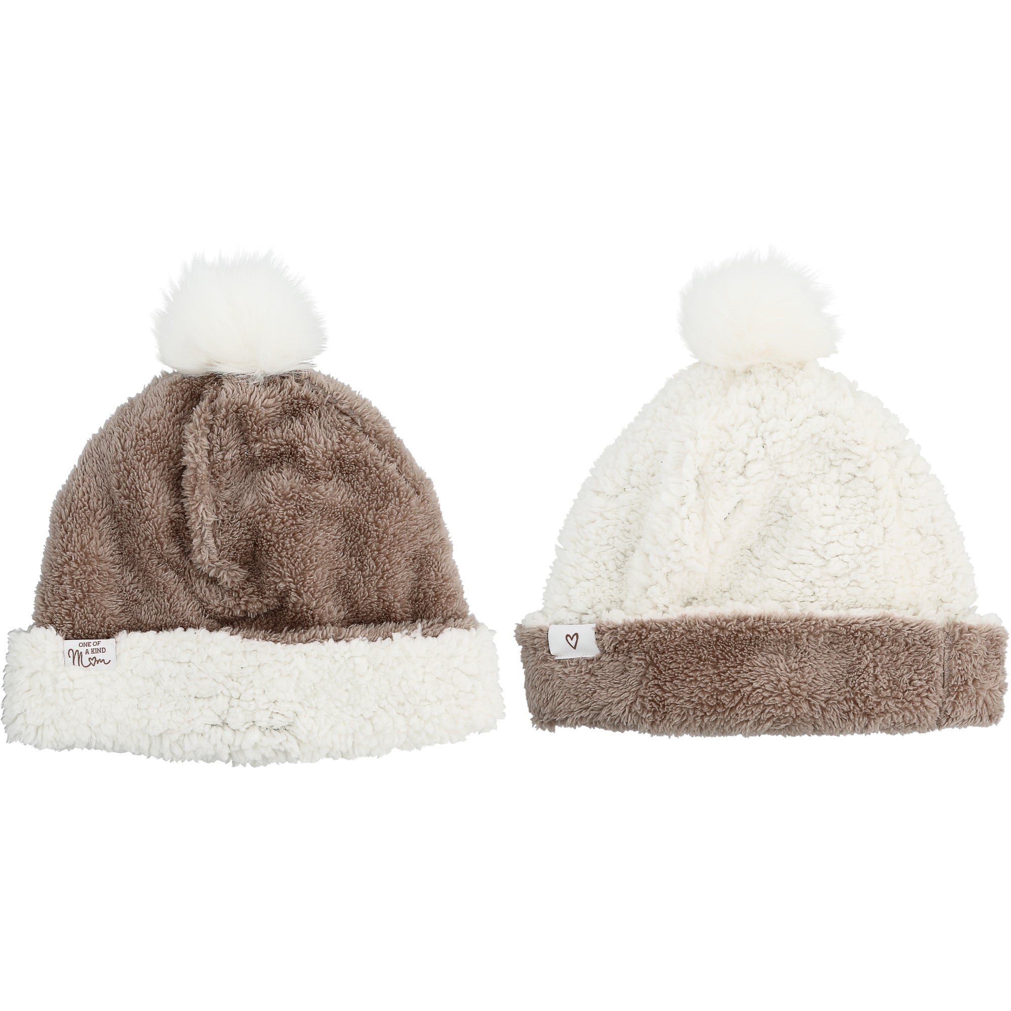 - PREMIUM QUALITY: Reversible super soft sherpa, faux fur hat made from 100% polyester fleece (brown side), 100% polyester sherpa (white side). It has a removable faux fur pom pom that attaches with a snap to wear with both sides of the hat. This item is one size fits most. The hat is packaged with a hangtag in a polybag.