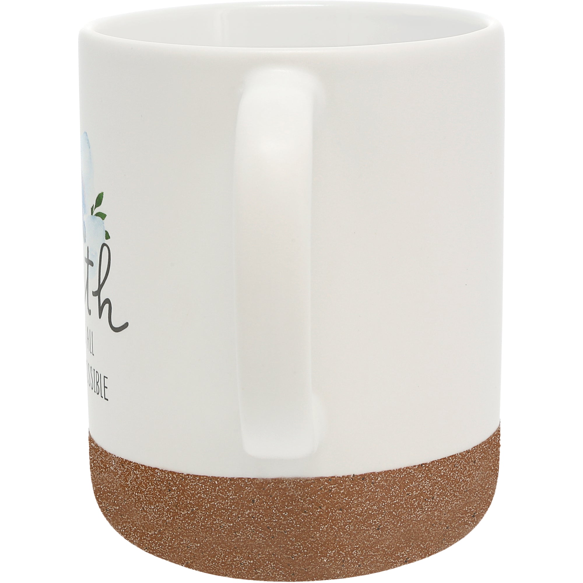 - IN-HOUSE DESIGN: The coffee cup features a glossy watercolor design encompassing a simple blue floral design accompanied by a "Faith Makes All Things Possible" blue & gray sentiment on the front. Illustrations created by artist Blue Chair Blessing.