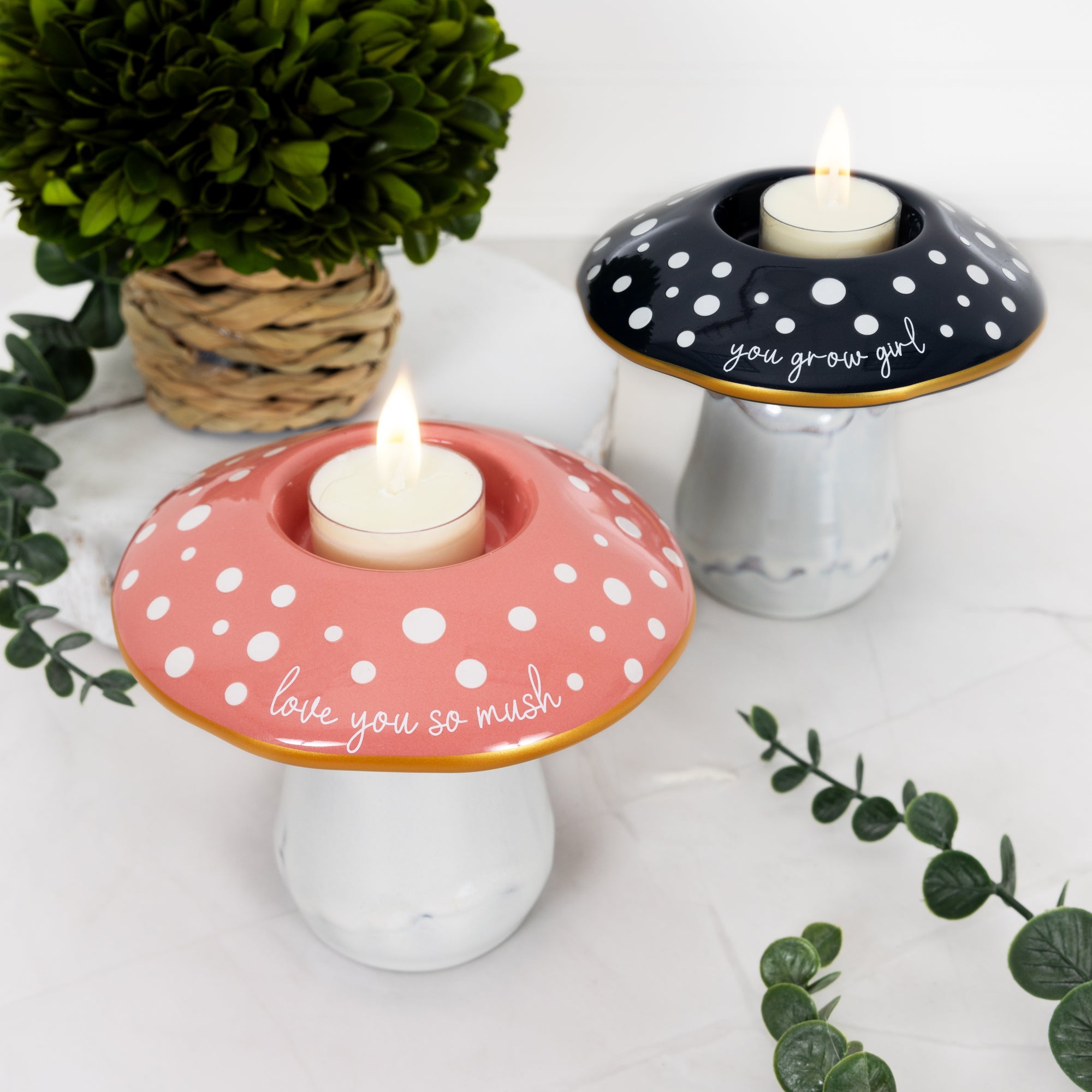 - IN-HOUSE DESIGN: The playful mushroom design features a glossy navy blue top with white polka dots, creating a delightful visual contrast. The raised decal on the mushroom top reads "You grow girl," written in a cheerful font that adds a lighthearted, encouraging sentiment to the piece. The combination of the raised polka dots and the uplifting message not only adds a whimsical touch but also makes this tealight holder a standout decorative item, perfect for a garden, kitchen, or living space.