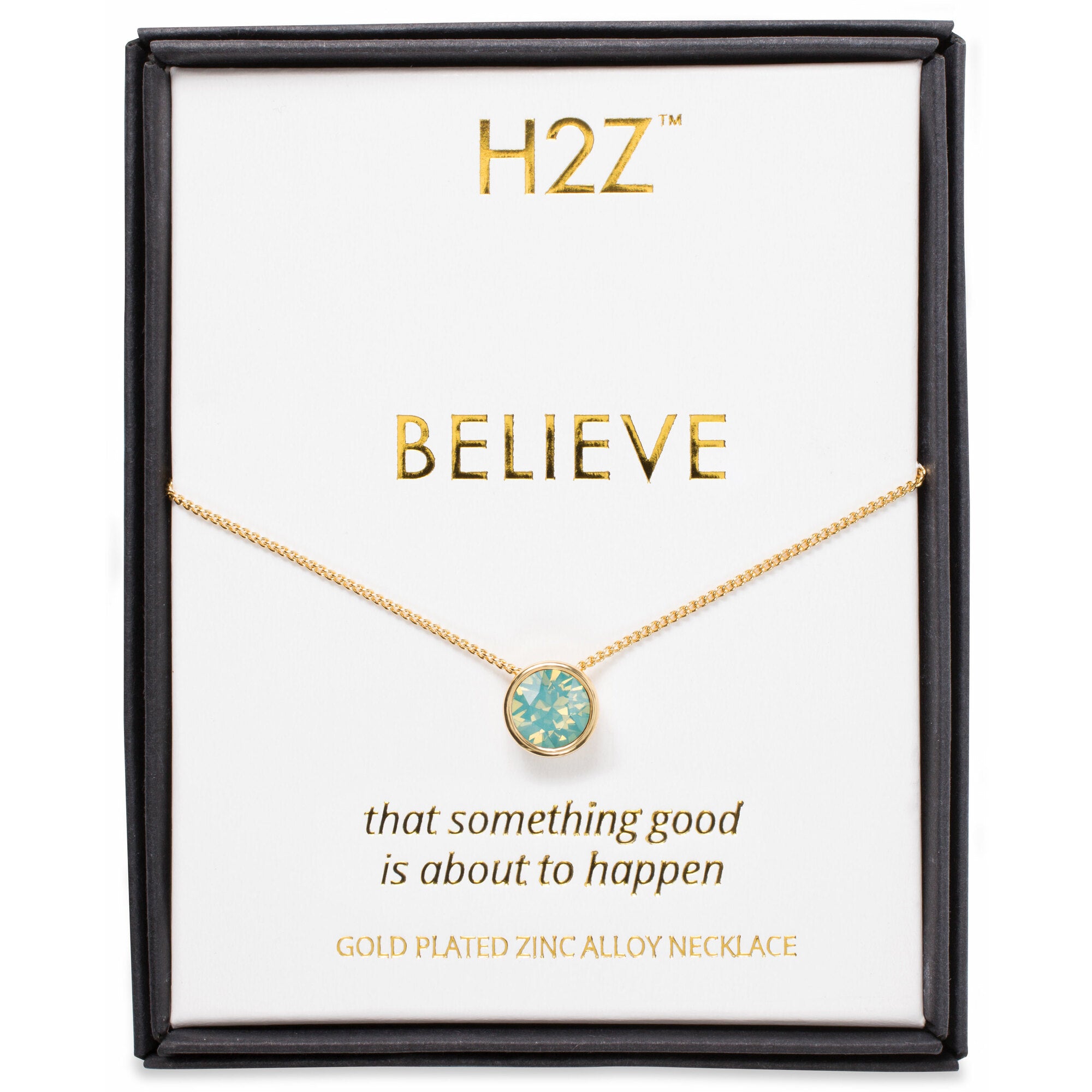 - IN-HOUSE DESIGN: Necklace contains one aqua opal crystal. "Believe; That Something Good Is About To Happen" text is printed onto the interior of the box.