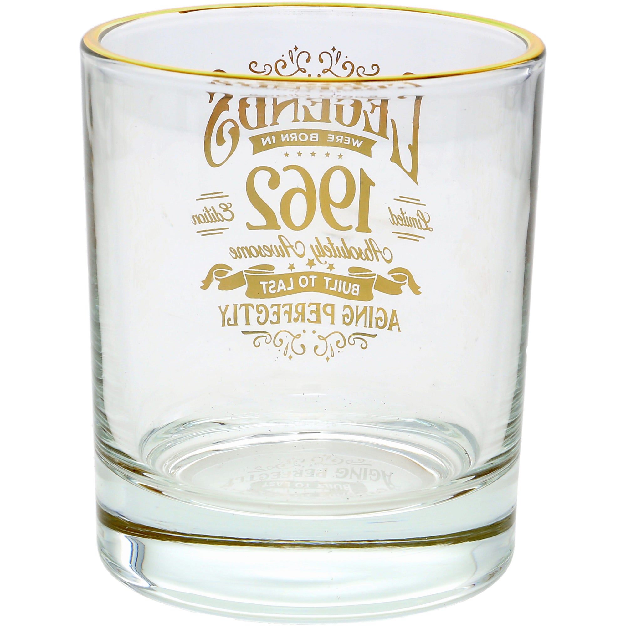 - IN-HOUSE DESIGN: The gold electroplated rim is accompanied by the gold "Legends Were Born In 1962, Limited Edition, Absolutely Awesome, Built To Last, Aging Perfectly" sentiment decal on the front side of the whiskey along with banners and stars.