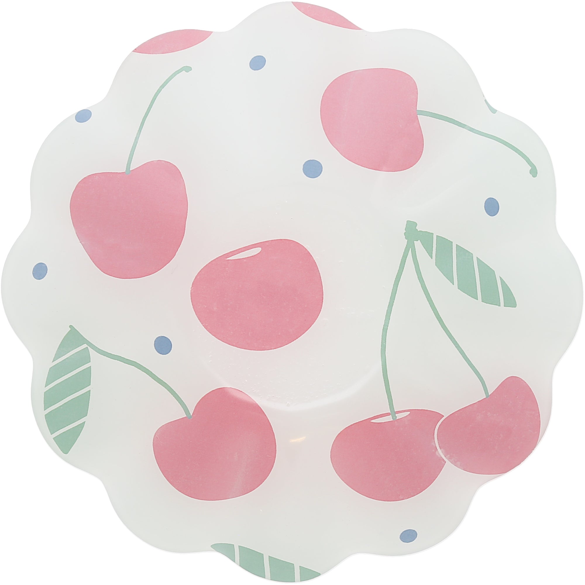 - IN-HOUSE DESIGN: Large and bold green-stemmed red cherries accompany blue polka dots on a white background.