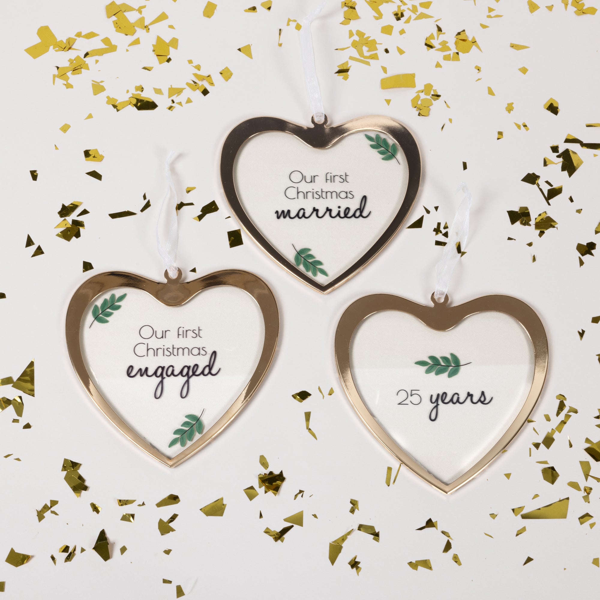 - PREMIUM QUALITY: Our 4.75" heart-shaped ornament is thoughtfully designed. The delicate mirrored golden acrylic border frames a clear glass center. It comes with a white organza 3.25" drop ribbon, allowing you to hang it carefully either on a tree during the holiday season, or a window year-round.