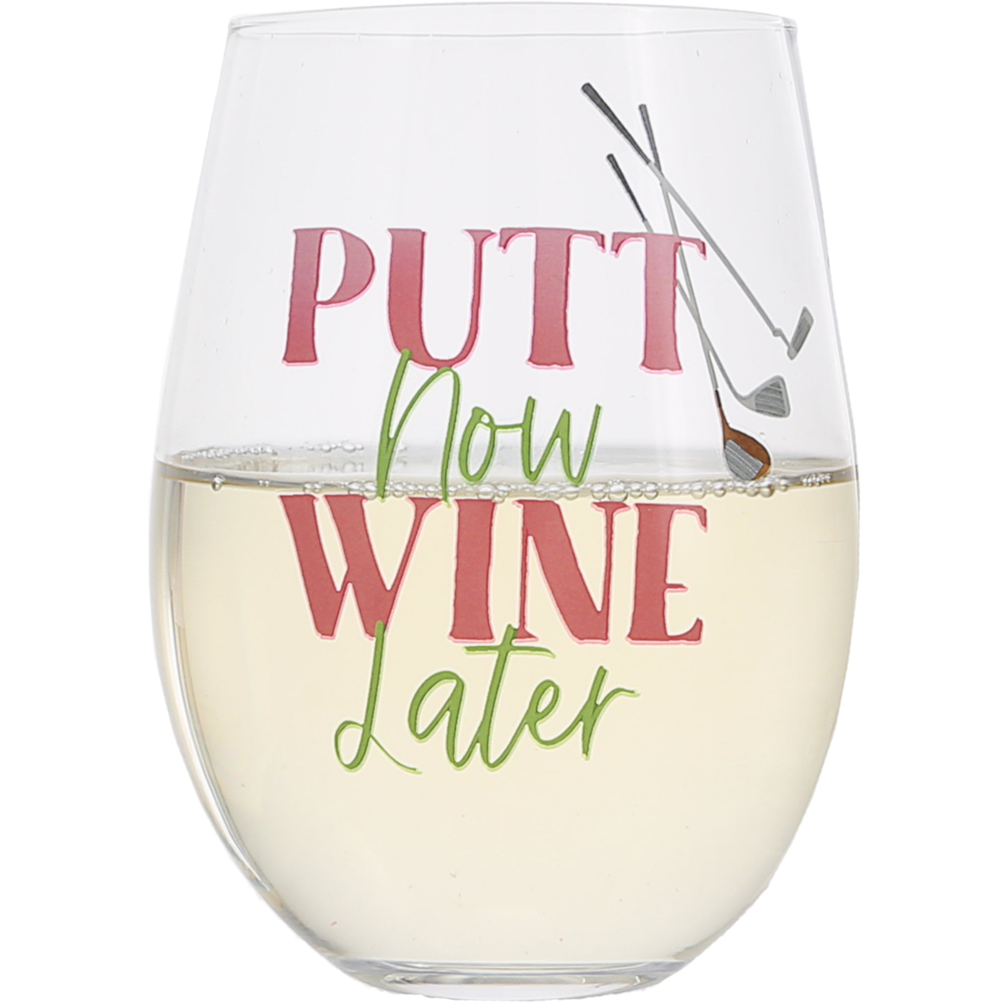 - IN-HOUSE DESIGN: The "Putt Now Wine Later" and triple golf club design is printed onto the front center of the wine glass.