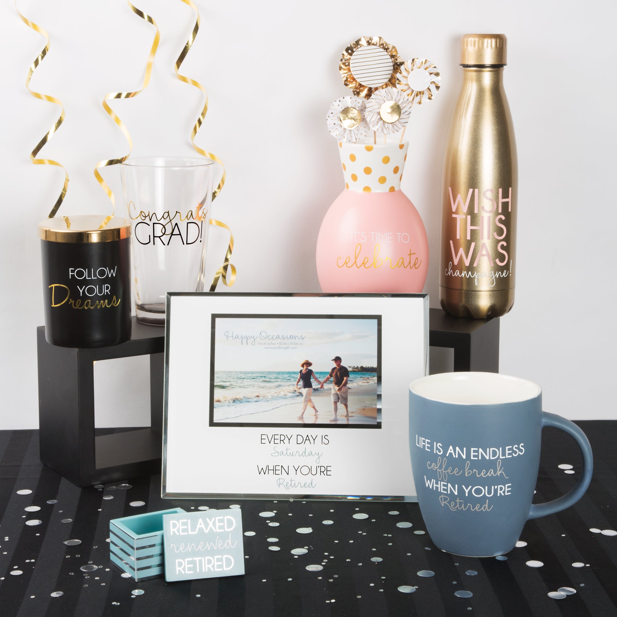• IN-HOUSE DESIGN: "It's Time To Celebrate" text is printed onto the front of the vase, while the gold dot design is printed all around the top of the vase.